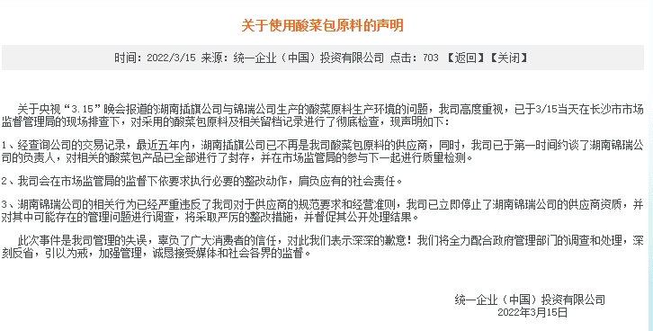 关于央视“3.15”晚会报道的湖南插旗公司与锦瑞公司生产的酸菜原料生产环境的问题,统一(中国)投资有限公司当晚在官网发布声明回应称,公司高度重视,已于3月15日当天在长沙市市场监督管理局的现场排查下,对采用的酸菜包原料及相关留档记录进行了彻底检查统一发布声明表示,湖南插旗公司自2012年12月开始,已不再是该公司酸菜包原料的供应商,同时,统一已于第一时间约谈了湖南锦瑞公司的负责人,对相关的酸菜包产品已全部进行了封存,并在市场监管局的参与下一起进行质量检测。