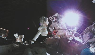 在北京航天飞行控制中心拍摄的叶光富出舱画面。新华社记者 郭中正摄