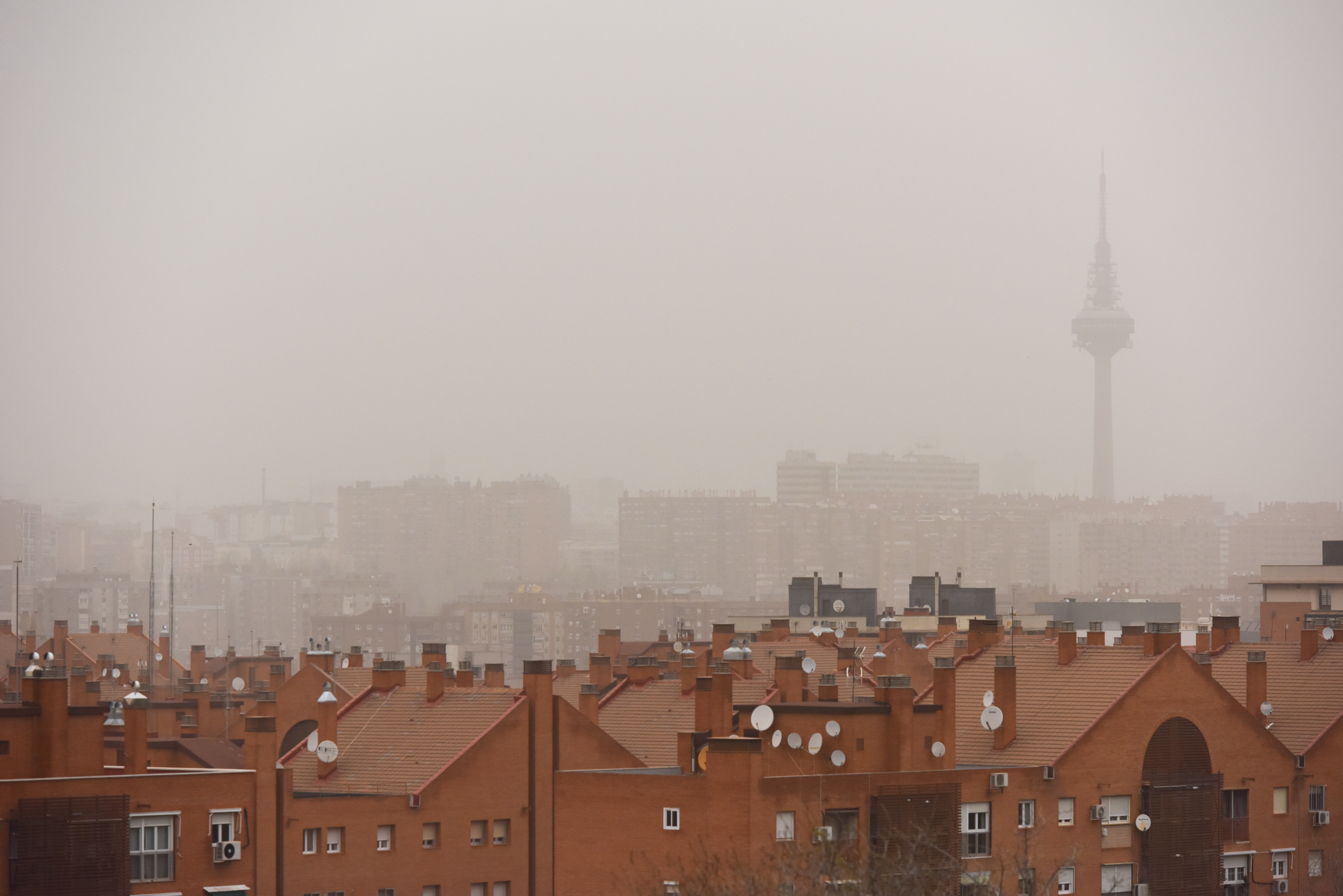 新华社照片,马德里,2022年3月16日 (国际)(4)马德里遭遇沙尘天气 3月15日,在西班牙马德里,建筑物笼罩在沙尘中。 新华社发(古斯塔沃·巴连特摄)