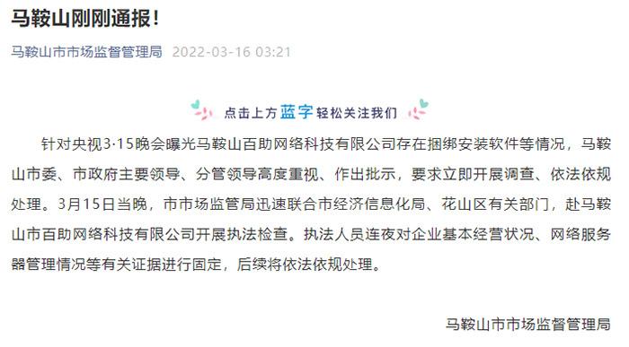 中新财经3月16日电(谢艺观) 马鞍山市市场监督管理局16日发布消息称,针对央视3·15晚会曝光马鞍山百助网络科技有限公司存在捆绑安装软件等情况,马鞍山市委、市政府主要领导、分管领导要求立即开展调查、依法依规处理。