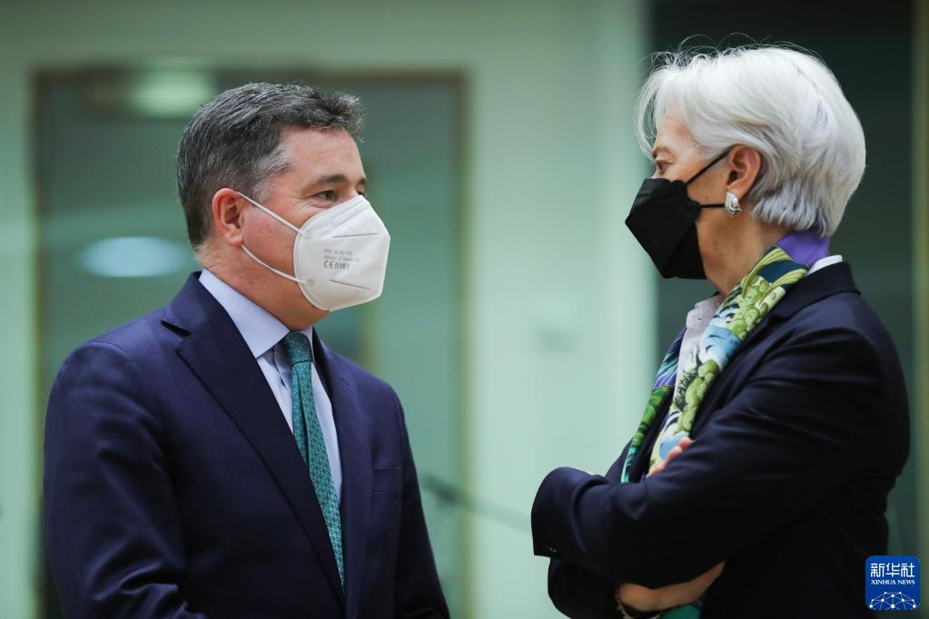 3月14日,欧元集团主席帕斯卡尔·多诺霍(左)与欧洲央行行长拉加德在比利时布鲁塞尔出席欧元集团会议时交谈。