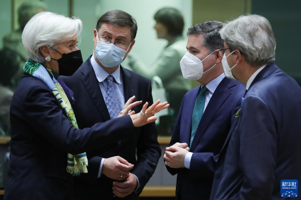 3月14日,欧洲央行行长拉加德(左一)、欧盟委员会负责经济事务的执行副主席瓦尔季斯·东布罗夫斯基斯(左二)、欧元集团主席帕斯卡尔·多诺霍(右二)、欧盟委员会负责经济事务的委员保罗·真蒂洛尼在比利时布鲁塞尔出席欧元集团会议。