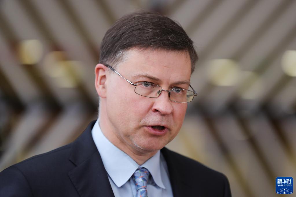 3月14日,欧盟委员会负责经济事务的执行副主席瓦尔季斯·东布罗夫斯基斯在比利时布鲁塞尔出席欧元集团会议前对媒体发言。