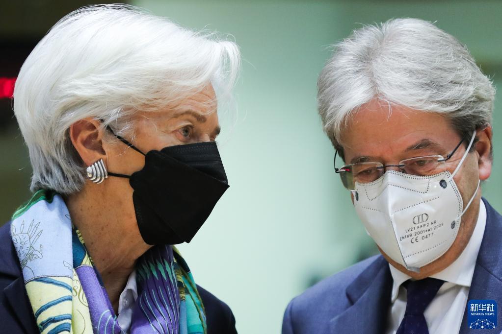 3月14日,欧洲央行行长拉加德(左)与欧盟委员会负责经济事务的委员保罗·真蒂洛尼在比利时布鲁塞尔出席欧元集团会议时交谈。