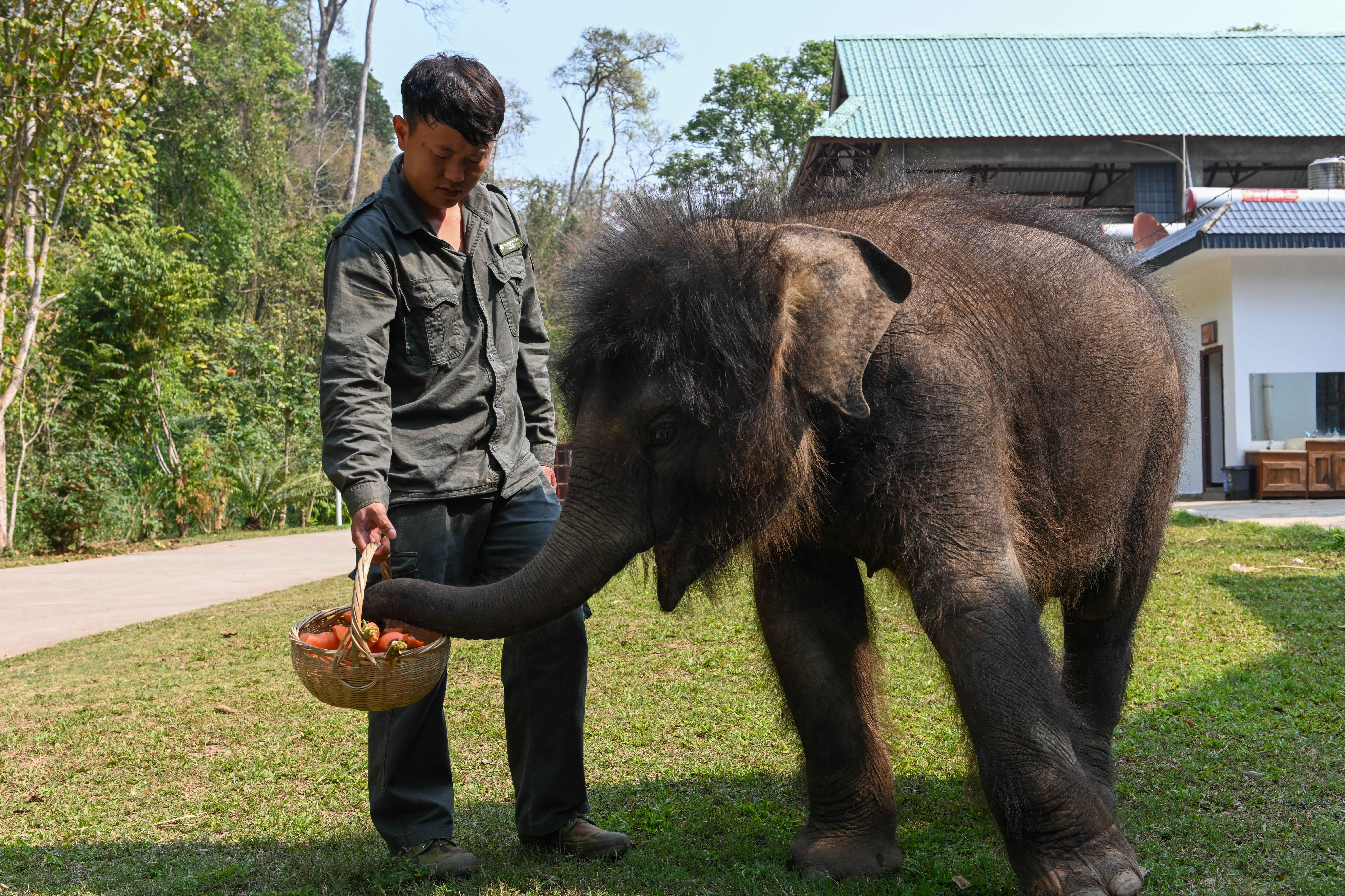 新华社照片,西双版纳(云南),2022年3月16日 萌象“龙龙”重生记 3月15日,在西双版纳傣族自治州亚洲象种源繁育及救助中心,“象爸爸”许云峰给救助象“龙龙”喂胡萝卜。 2021年7月,在云南省西双版纳傣族自治州景洪市,一头出生约两个月的亚洲象被藤蔓缠绕导致左前腿受伤溃烂感染,因无法跟上象群而被遗弃。当时,西双版纳州多部门联合实施紧急救助,这头幼象被送到云南亚洲象种源繁育及救助中心安置治疗。因幼象被救助地位于景洪市普文镇曼飞龙村委会支龙村小组,地名里有两个“龙”字,所以它被取名为“龙龙”。 在专职驯养员“象爸爸”的悉心照料下,“龙龙”的身体逐渐康复,恢复顽皮可爱的天性。“我走到哪里它都要跟着,有时会用鼻子揪我的头发,还把泥巴蹭到我的身上。”“龙龙”的专职“象爸爸”许云峰说。现在,“龙龙”跟着“象爸爸”进行野化训练、定期接受体检……在云南亚洲象种源繁育及救助中心,小象重获新生。 云南亚洲象种源繁育及救助中心为西双版纳丛林中遭遇困难的野象提供庇护港湾,自2008年建成投入使用以来,先后参与过21次亚洲象野外救助工作,成功救助20多头不同年龄段的野生亚洲象。 新华社记者 曹梦瑶 摄