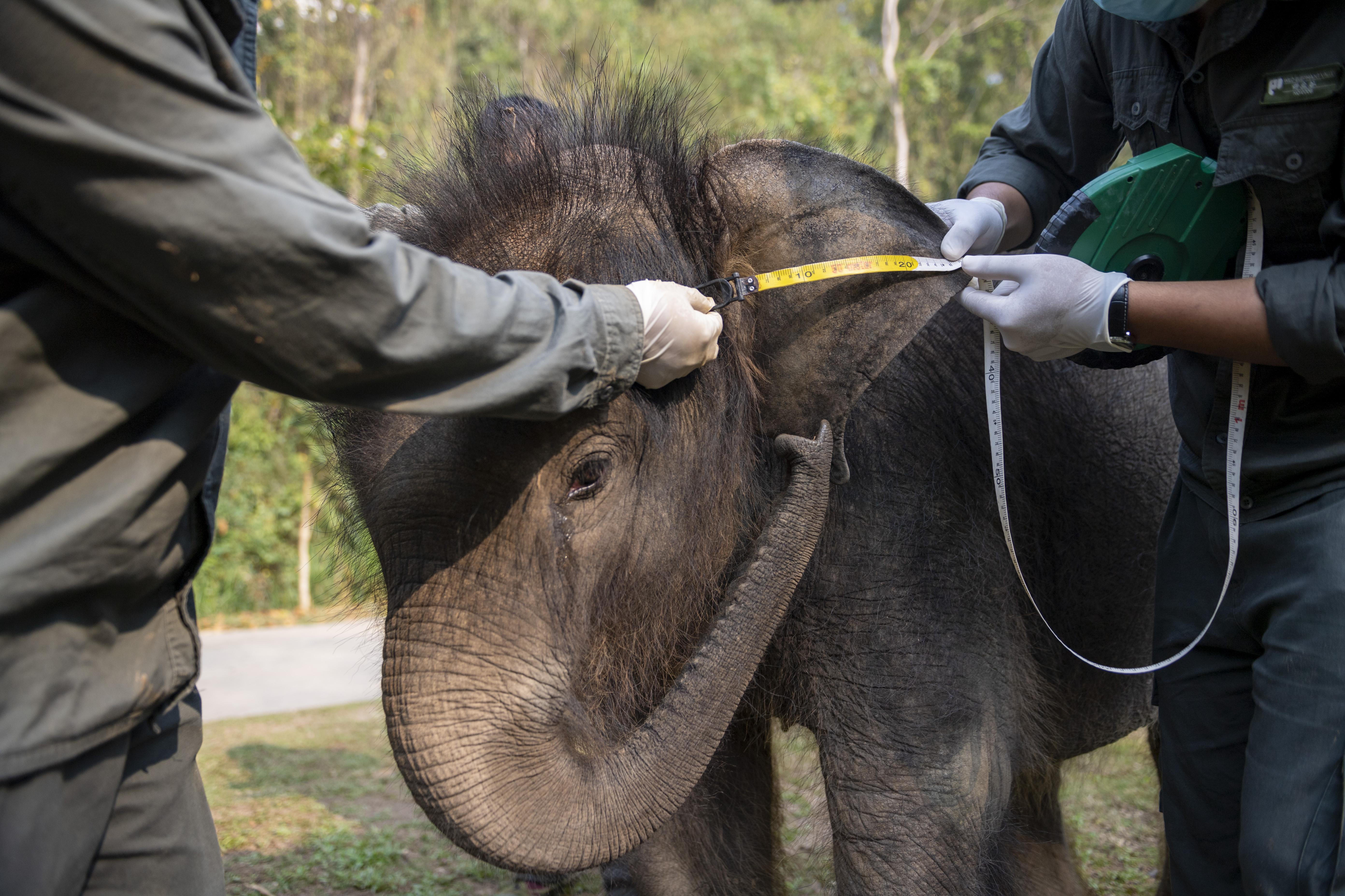 新华社照片,西双版纳(云南),2022年3月16日 萌象“龙龙”重生记 3月15日,工作人员为小象“龙龙”在进行例行体检时测量小象耳朵。 2021年7月,在云南省西双版纳傣族自治州景洪市,一头出生约两个月的亚洲象被藤蔓缠绕导致左前腿受伤溃烂感染,因无法跟上象群而被遗弃。当时,西双版纳州多部门联合实施紧急救助,这头幼象被送到云南亚洲象种源繁育及救助中心安置治疗。因幼象被救助地位于景洪市普文镇曼飞龙村委会支龙村小组,地名里有两个“龙”字,所以它被取名为“龙龙”。 在专职驯养员“象爸爸”的悉心照料下,“龙龙”的身体逐渐康复,恢复顽皮可爱的天性。“我走到哪里它都要跟着,有时会用鼻子揪我的头发,还把泥巴蹭到我的身上。”“龙龙”的专职“象爸爸”许云峰说。现在,“龙龙”跟着“象爸爸”进行野化训练、定期接受体检……在云南亚洲象种源繁育及救助中心,小象重获新生。 云南亚洲象种源繁育及救助中心为西双版纳丛林中遭遇困难的野象提供庇护港湾,自2008年建成投入使用以来,先后参与过21次亚洲象野外救助工作,成功救助20多头不同年龄段的野生亚洲象。 新华社记者 陈欣波 摄