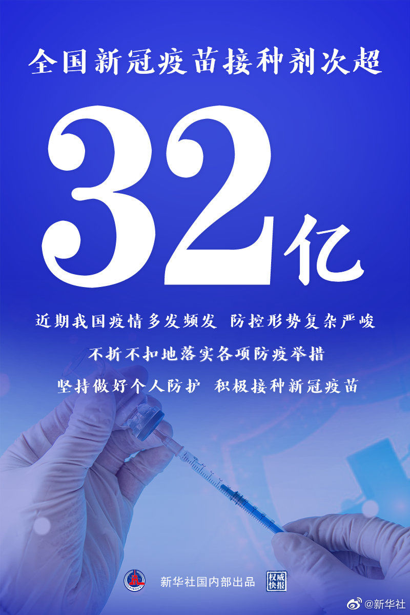 【权威快报丨全国新冠疫苗接种剂次超32亿】国家卫健委3月16日通报,全国新冠疫苗接种剂次超32亿。近期我国疫情多发频发,防控形势复杂严峻。坚持“外防输入、内防反弹”总策略、“动态清零”总方针不动摇、不放松。不折不扣地落实各项防疫举措,尽快遏制疫情扩散势头。坚持做好个人防护,积极接种新冠疫苗。(记者宋晨)