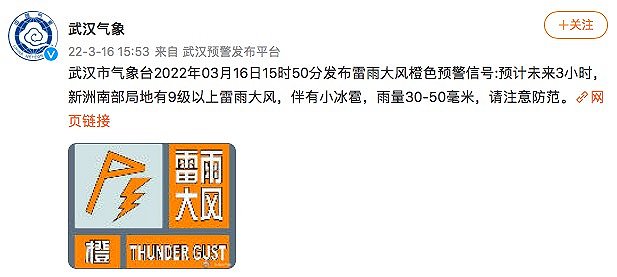 据@武汉气象 微博消息,武汉市气象台2022年03月16日15时50分发布雷雨大风橙色预警信号:预计未来3小时,新洲南部局地有9级以上雷雨大风,伴有小冰雹,雨量30-50毫米,请注意防范。
