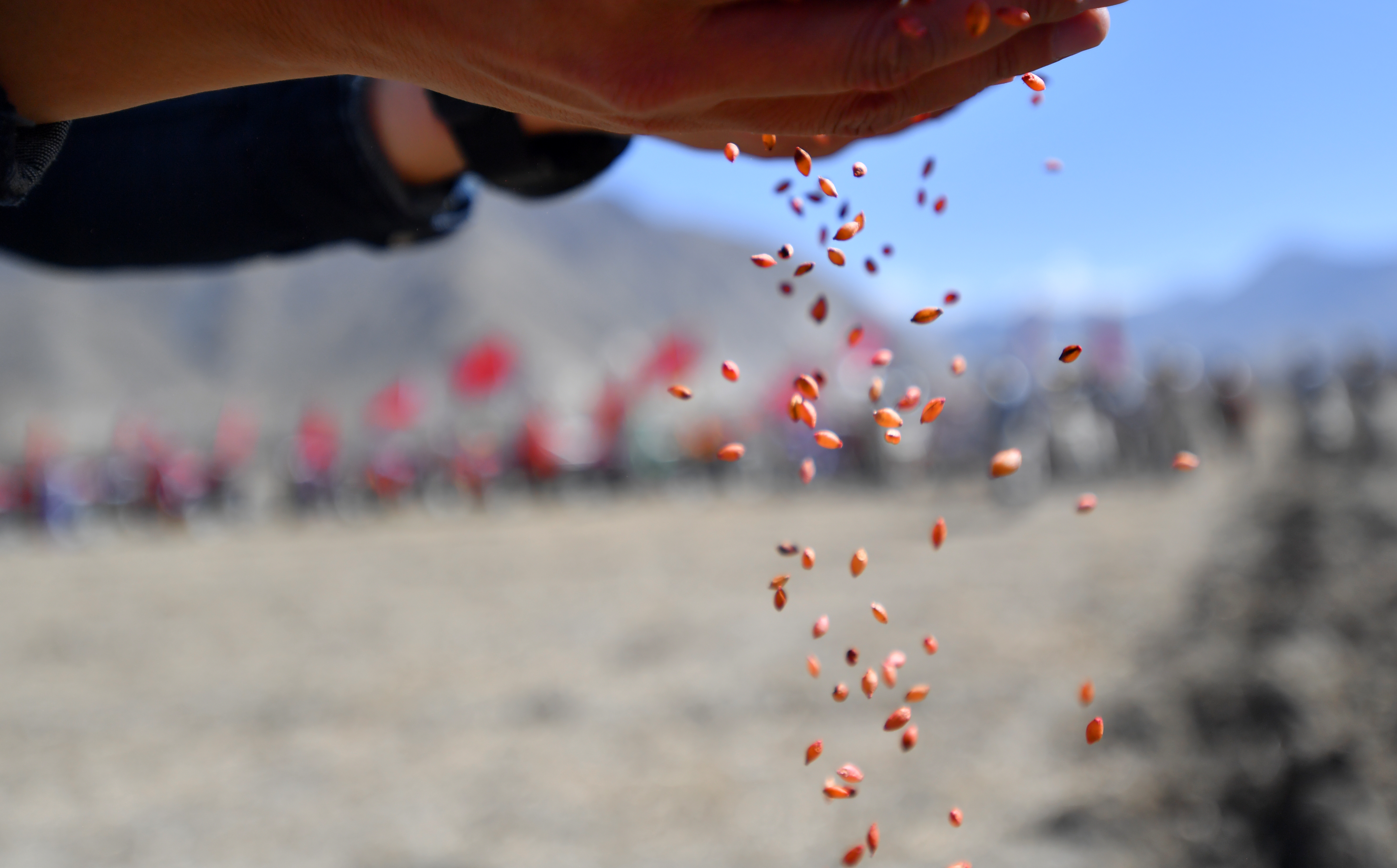 新华社照片,拉萨,2022年3月16日 迎接春天的典礼——西藏各地举行春耕仪式 3月16日,村民在西藏拉萨市曲水县茶巴朗村春耕仪式上播撒种子。 当日,西藏各地举行一年一度的春耕仪式。春耕在西藏农民的眼中,是一年之中最为隆重的农事活动,各地举行盛大的春耕仪式,祈福一年的丰收。 新华社记者 觉果 摄