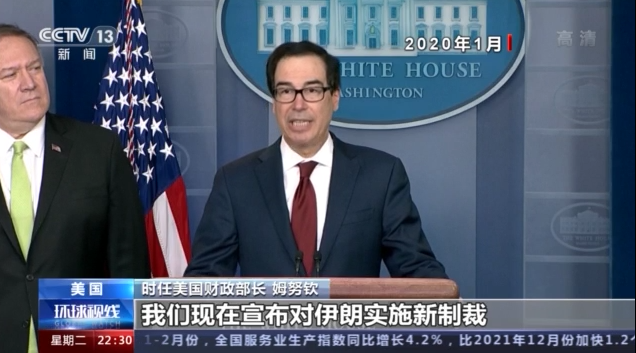 时任美国财政部长姆努钦:正如总统先前宣布的,我们宣布对伊朗实施新制裁。