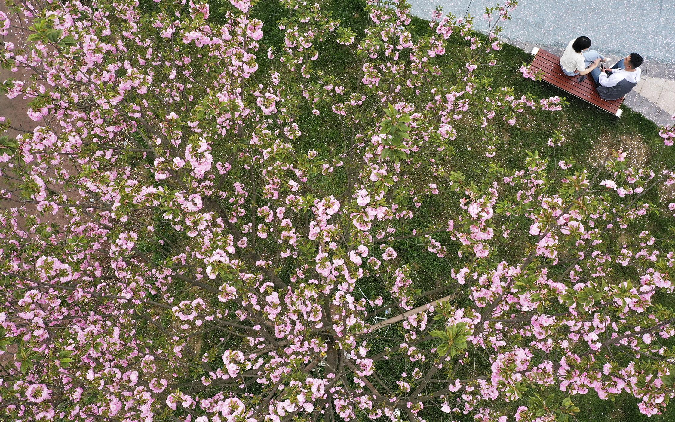新华社照片,广安(四川),2022年3月16日 大地着春装 樱花伴春开 3月16日,游人在四川省广安市一处公园内踏青赏花(无人机照片)。 连日来,随着气温升高,我国多地的樱花次第绽放,呈现出一片生机勃勃的春日景象。 新华社发(张启富 摄)
