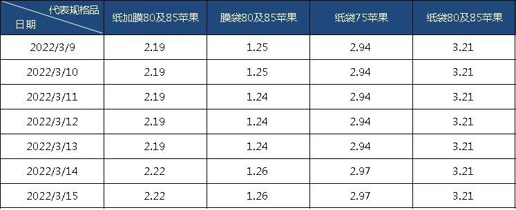 指数监测显示,截至3月15日,纸加膜80及85规格富士苹果均价为2.22元/斤,膜袋80及85规格富士苹果均价为1.26元/斤,纸袋75规格富士苹果均价为2.97元/斤,纸袋80及85规格富士苹果均价为3.21元/斤。