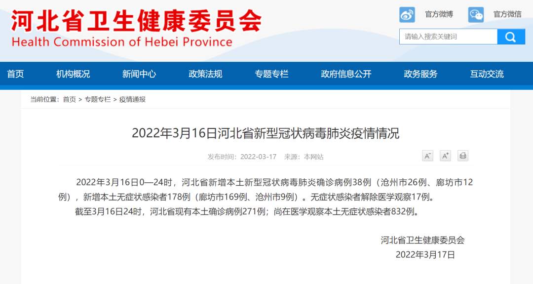 2022年3月16日0—24时,河北省新增本土新型冠状病毒肺炎确诊病例38例(沧州市26例、廊坊市12例),新增本土无症状感染者178例(廊坊市169例、沧州市9例)。无症状感染者解除医学观察17例。