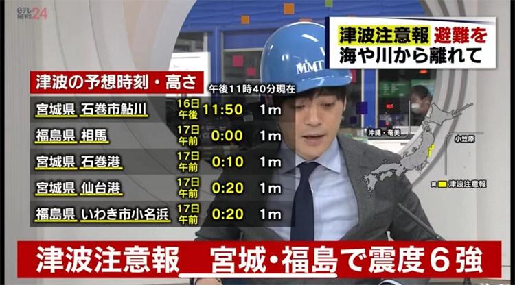 3月16日日本福岛县海域发生7.4级地震,当地发出海啸警报。图片来源:日本新闻报道截图