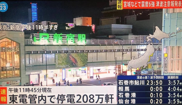 3月16日日本福岛县海域发生7.4级地震,导致大规模停电。图片来源:日本电视台报道截图
