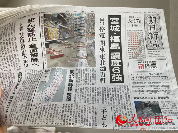 3月17日,日本《朝日新闻》在头版头条大篇幅刊登了地震报道。人民网 吴颖摄