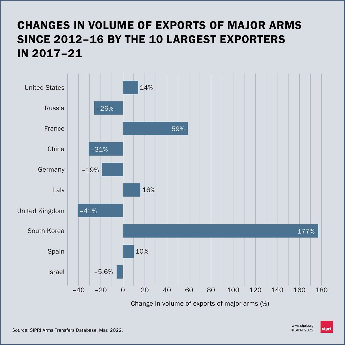 △2017-2021年全球十大武器出口国军售额自2012-2016年以来的变化 图片来源:SIPRI