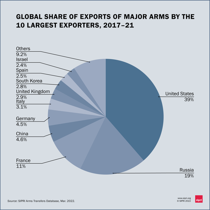 △2017年-2021年全球大出口武器出口国占全球份额图片来源:SIPRI