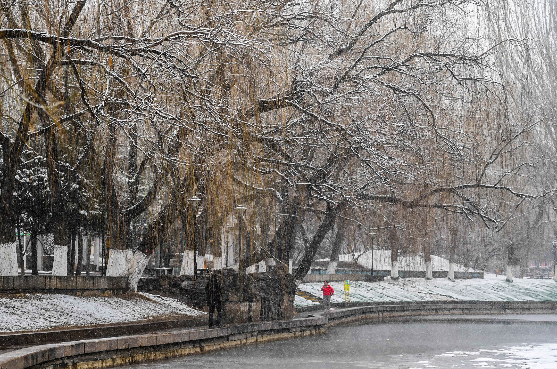 新华社照片,呼和浩特,2022年3月17日 塞外初春迎飞雪 3月17日,游人在呼和浩特市满都海公园欣赏雪景。 当日,受强冷空气影响,内蒙古呼和浩特市气温骤降,迎来一场春雪。 新华社记者 彭源 摄