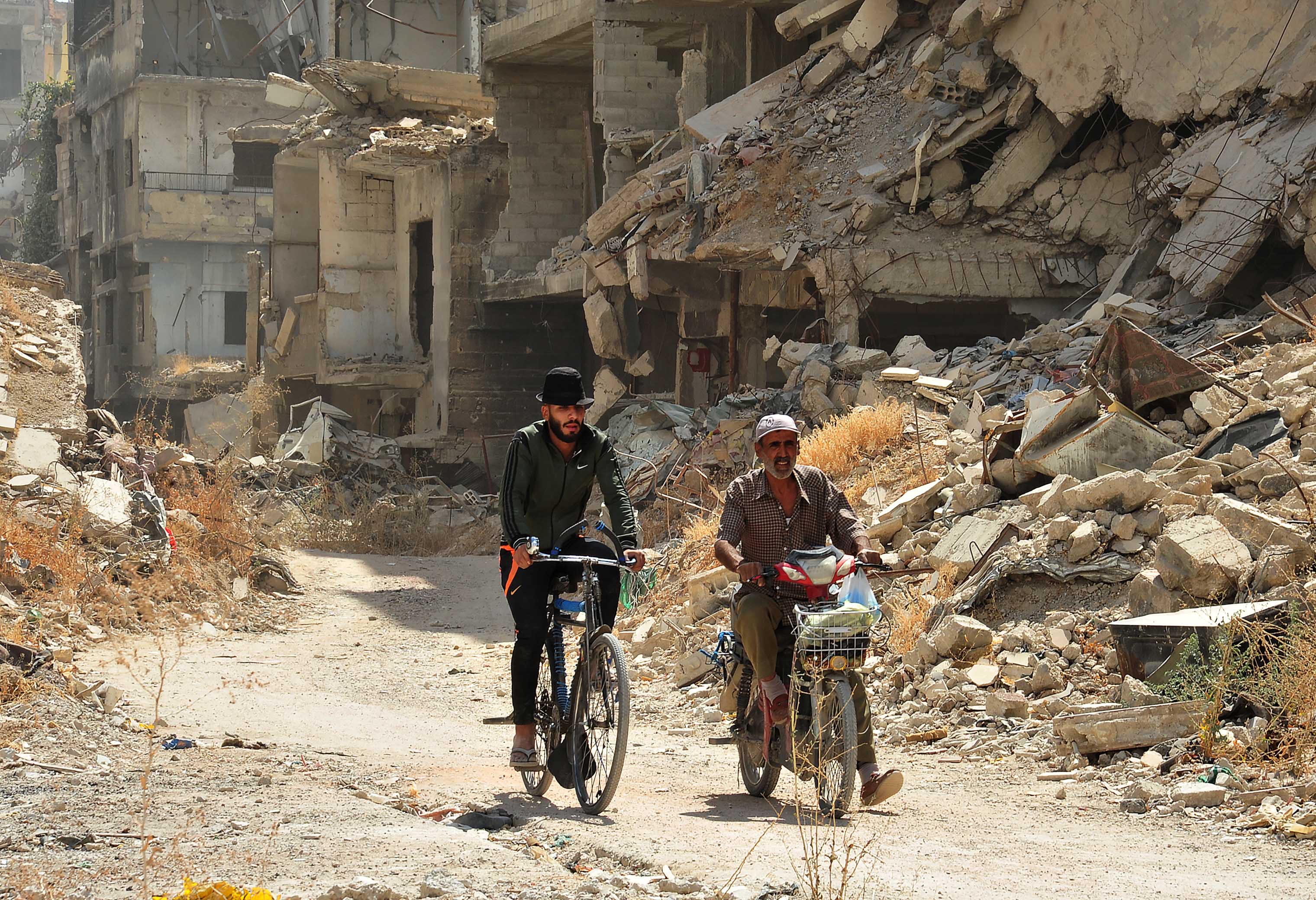 2021年9月23日,在叙利亚首都大马士革城南的巴勒斯坦难民聚居区——耶尔穆克难民营,骑车人在废墟间骑行。新华社发(阿马尔·萨法尔贾拉尼摄)