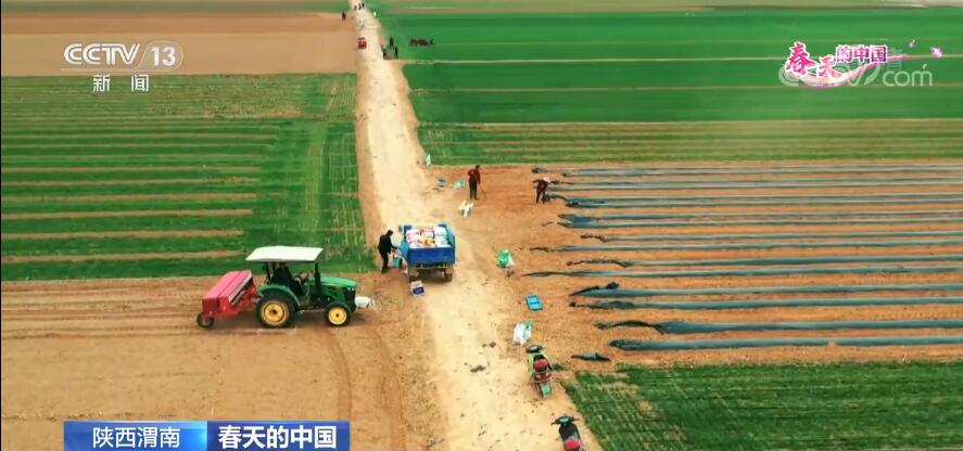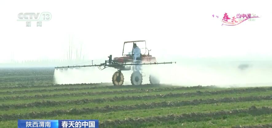 我们现在看到的是有着“关中粮仓”之称的陕西渭南。沃野千里,麦苗青青。正值返青期的麦苗儿宛若精心织就的锦缎,绵延在广阔而肥沃的土地上。农业机械在田间穿行,无人机从空中飞过,对麦田进行水肥一体化灌溉。目前,渭南市在田的小麦面积达432万亩,当地派出农业技术人员培训各类种粮主体、大户和农民约1万人次,抢抓农时,做好田间管理,为丰收夯实基础。