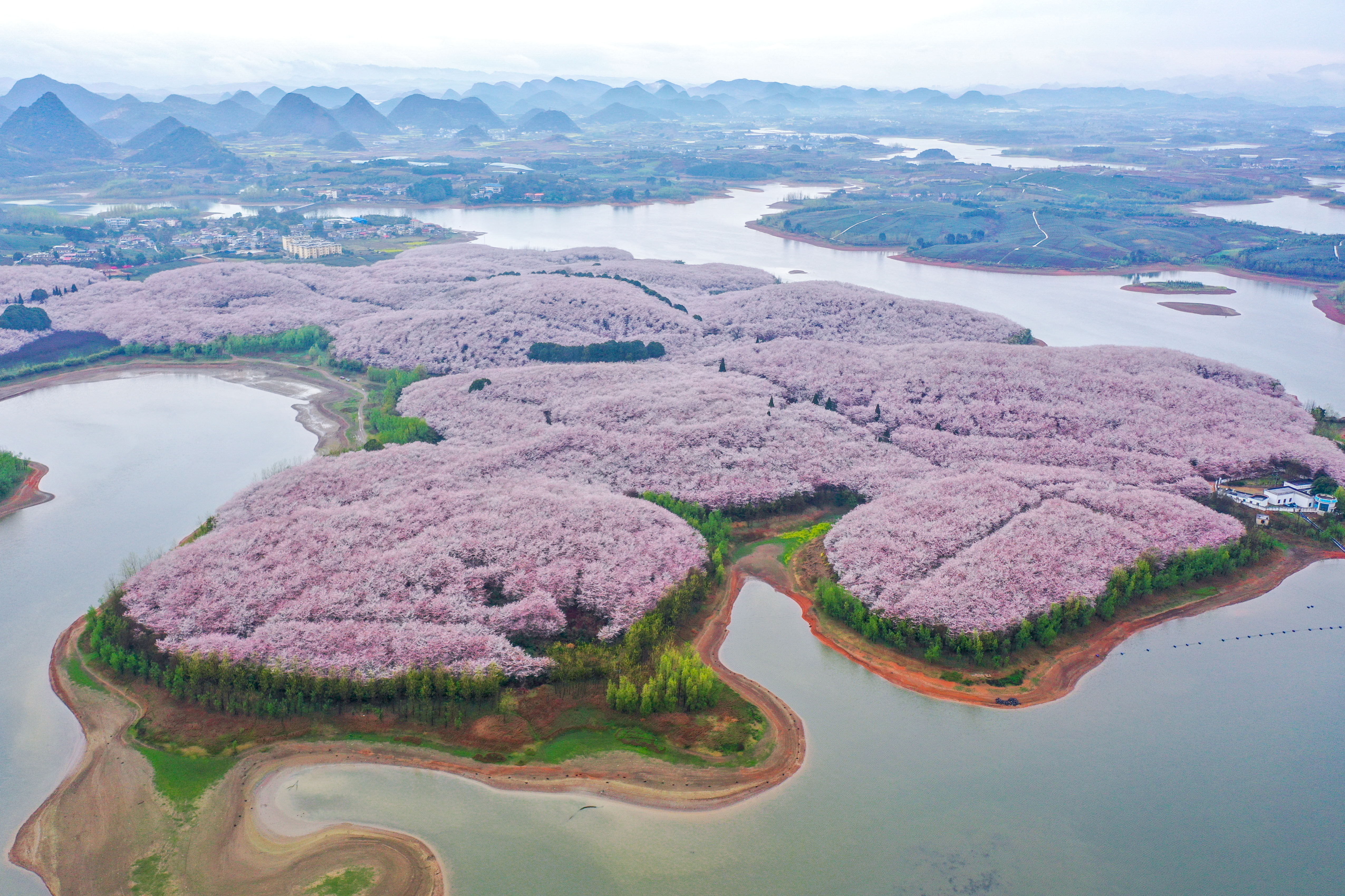 新华社照片,贵阳,2022年3月17日 贵州:大美樱花 春日竞放 这是3月17日拍摄的贵安新区樱花园(无人机照片)。 近日,贵州省贵安新区樱花园内樱花竞相盛开,吸引不少游客前来观赏。贵安新区樱花园占地面积2.4万余亩,园内种植近70万株樱花。 新华社记者 欧东衢 摄