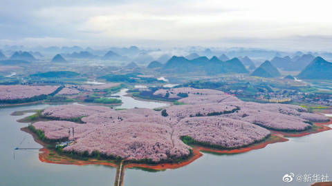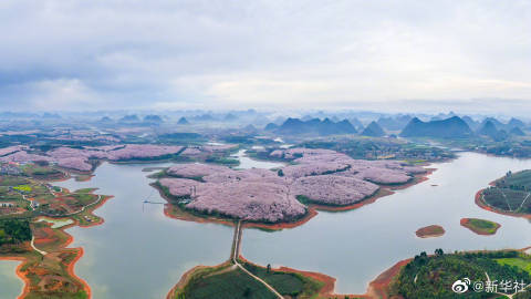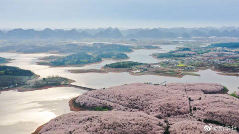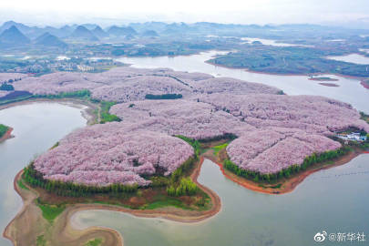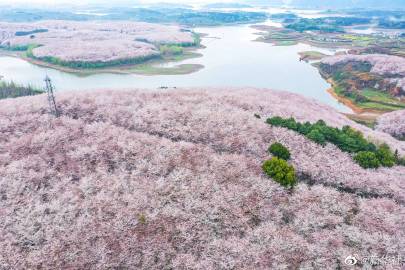 【#贵州大美樱花春日竞放#】近日,贵州省贵安新区樱花园内樱花竞相盛开,吸引不少游客前来观赏。贵安新区樱花园占地面积2.4万余亩,园内种植近70万株樱花。