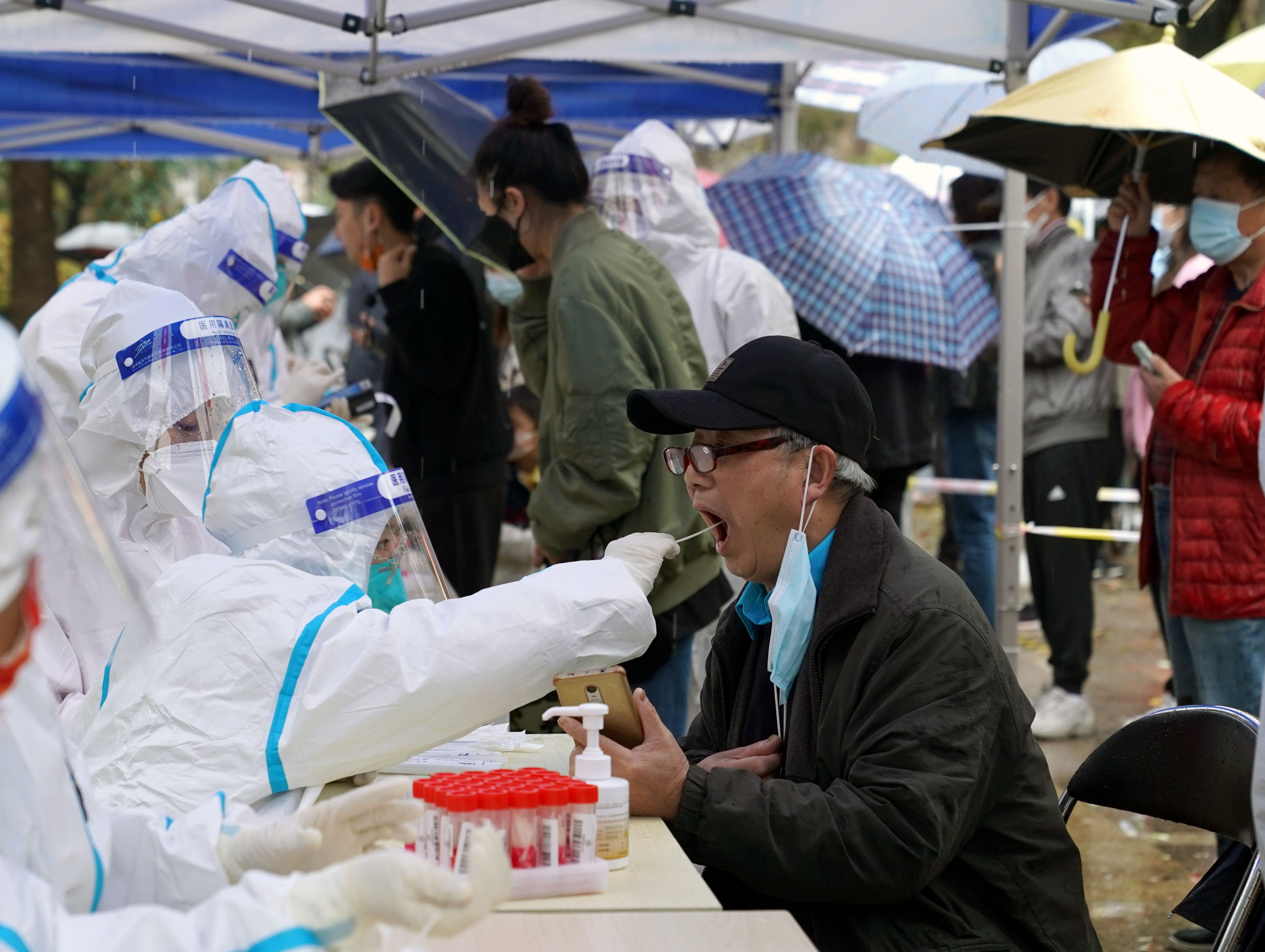 新华社照片,上海,2022年3月17日 冒雨奔忙 “大白”在行动 3月17日,在松江区象屿品城小区,医务人员为居民进行核酸采样。 当日,上海迎来降雨降温天气,医务人员、警察、社区工作者、志愿者等坚守抗疫一线,为民服务。3月16日、17日,上海启动新一轮网格化核酸筛查。 新华社记者 刘颖 摄