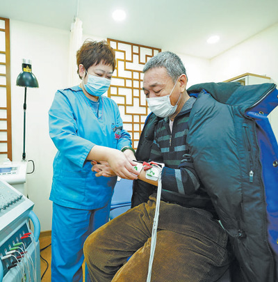 王金富在驻养老驿站医生指导下接受康复治疗。