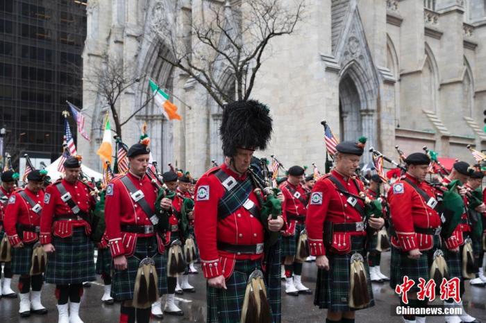 当地时间3月17日,纽约圣帕特里克节游行活动中的乐队队员向新冠逝者默哀。 中新社记者 廖攀 摄