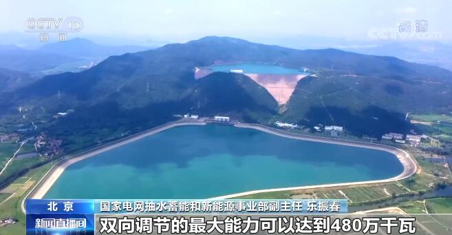 国家电网抽水蓄能和新能源事业部副主任 乐振春:我们这两座抽水蓄能电站分别位于华东和华中(地区)两个地方,总的装机容量两个电站是240万千瓦,双向调节的最大能力可以达到480万千瓦。它既可以提高我们电网的调峰能力,保障我们系统的安全稳定运行,更能促进风、光等清洁能源的消纳。