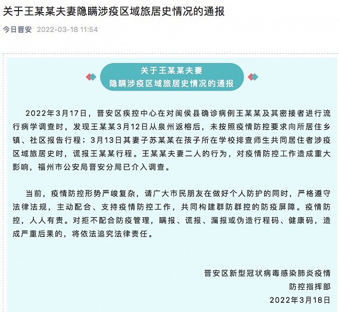 据”今日晋安“公众号消息,晋安区新型冠状病毒感染肺炎疫情防控指挥部发布通报称,2022年3月17日,晋安区疾控中心在对闽侯县确诊病例王某某及其密接者进行流行病学调查时,发现王某某3月12日从泉州返榕后,未按照疫情防控要求向所居住乡镇、社区报告行程;3月13日其妻子苏某某在孩子所在学校排查师生共同居住者涉疫区域旅居史时,谎报王某某行程。王某某夫妻二人的行为,对疫情防控工作造成重大影响,福州市公安局晋安分局已介入调查。