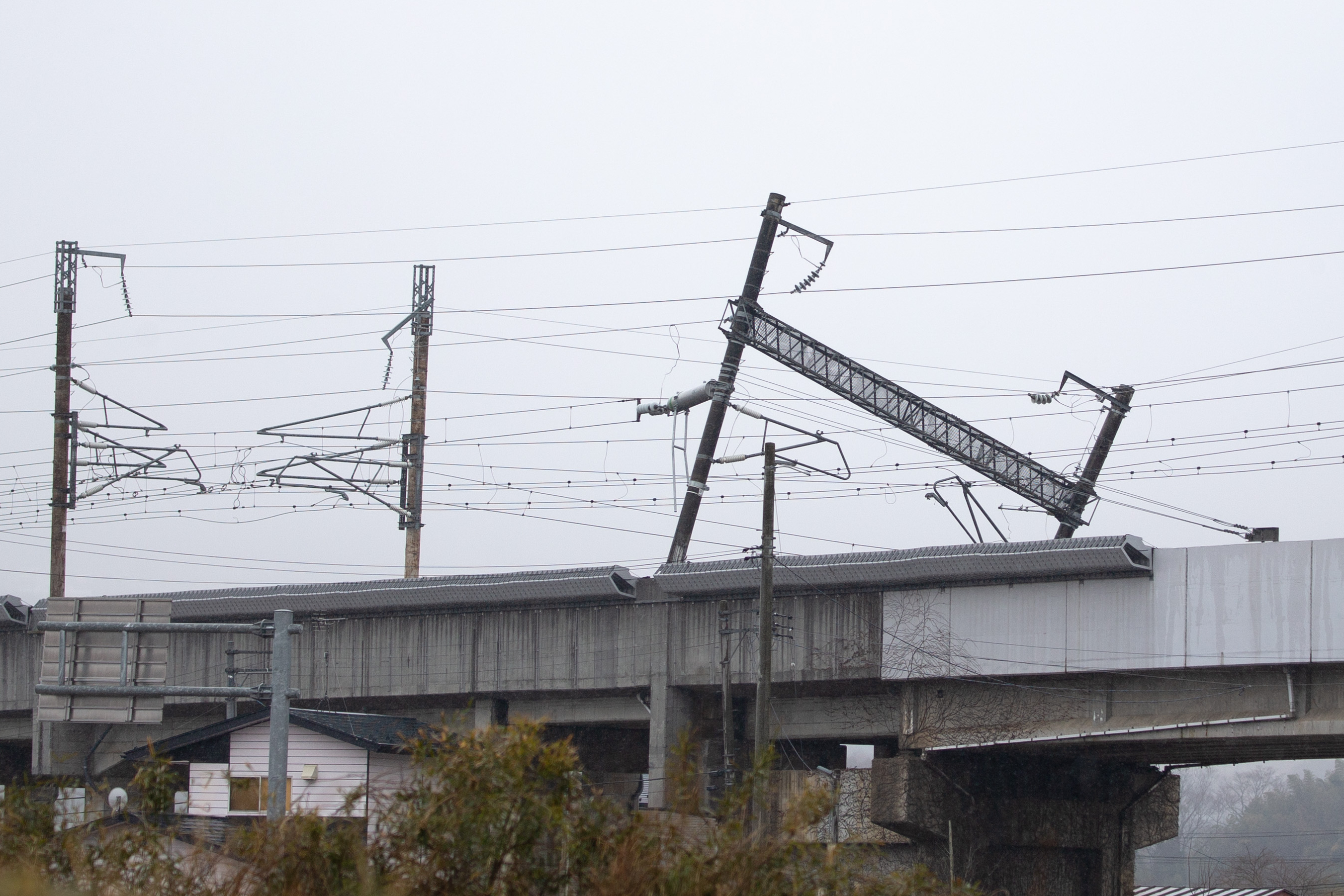 新华社照片,宫城县(日本),2022年3月18日 (国际)(7)日本地震致新干线列车脱轨 这是3月18日在日本宫城县白石市拍摄的因地震倾斜的新干线电线杆。 日本福岛县附近海域16日夜间发生地震。东北新干线列车在福岛站至白石藏王站区间发生脱轨,部分车厢倾斜。 新华社记者 张笑宇 摄