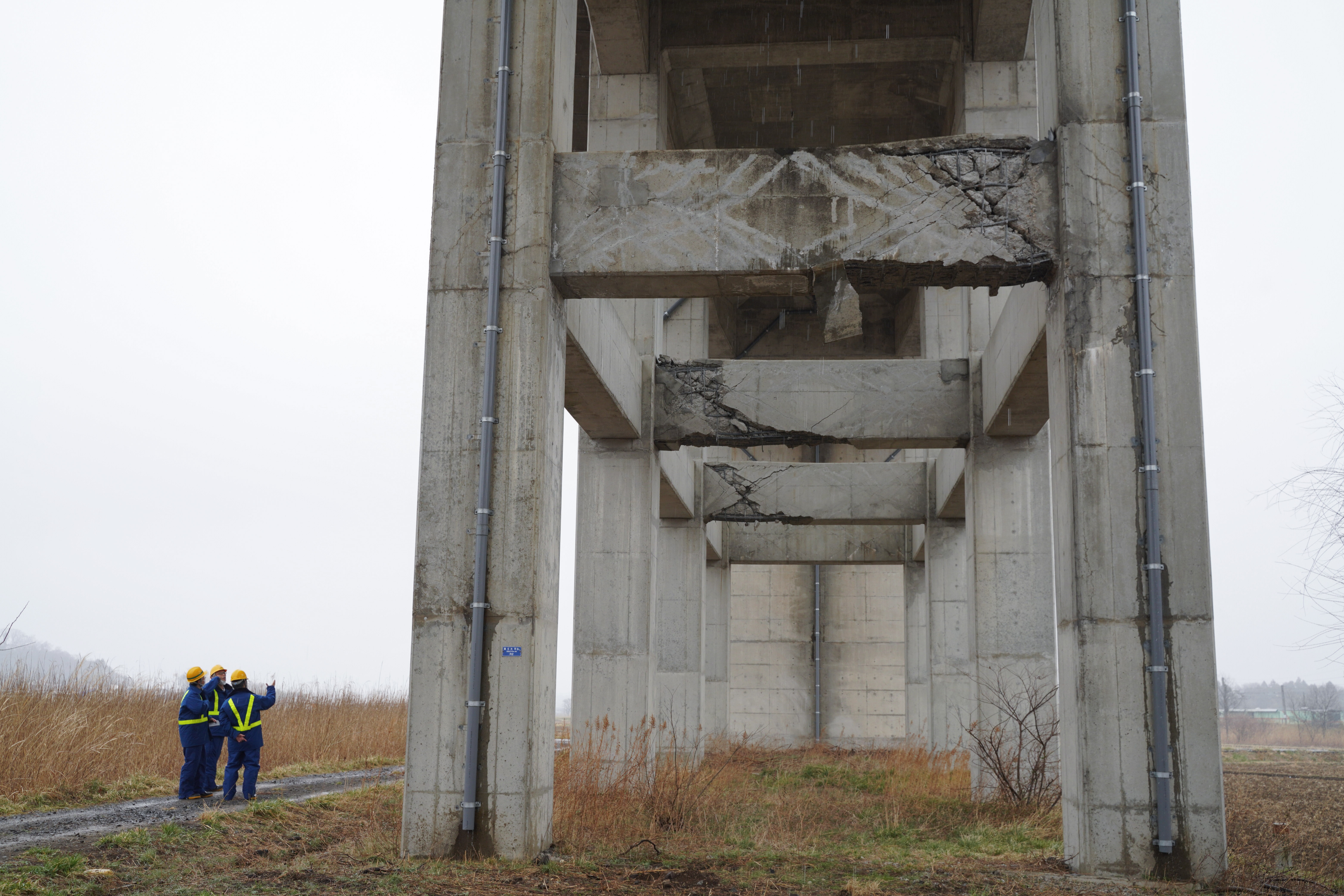新华社照片,宫城县(日本),2022年3月18日 (国际)(4)日本地震致新干线列车脱轨 3月18日,在日本宫城县白石市,施工人员对受损设施进行检修。 日本福岛县附近海域16日夜间发生地震。东北新干线列车在福岛站至白石藏王站区间发生脱轨,部分车厢倾斜。 新华社记者 张笑宇 摄