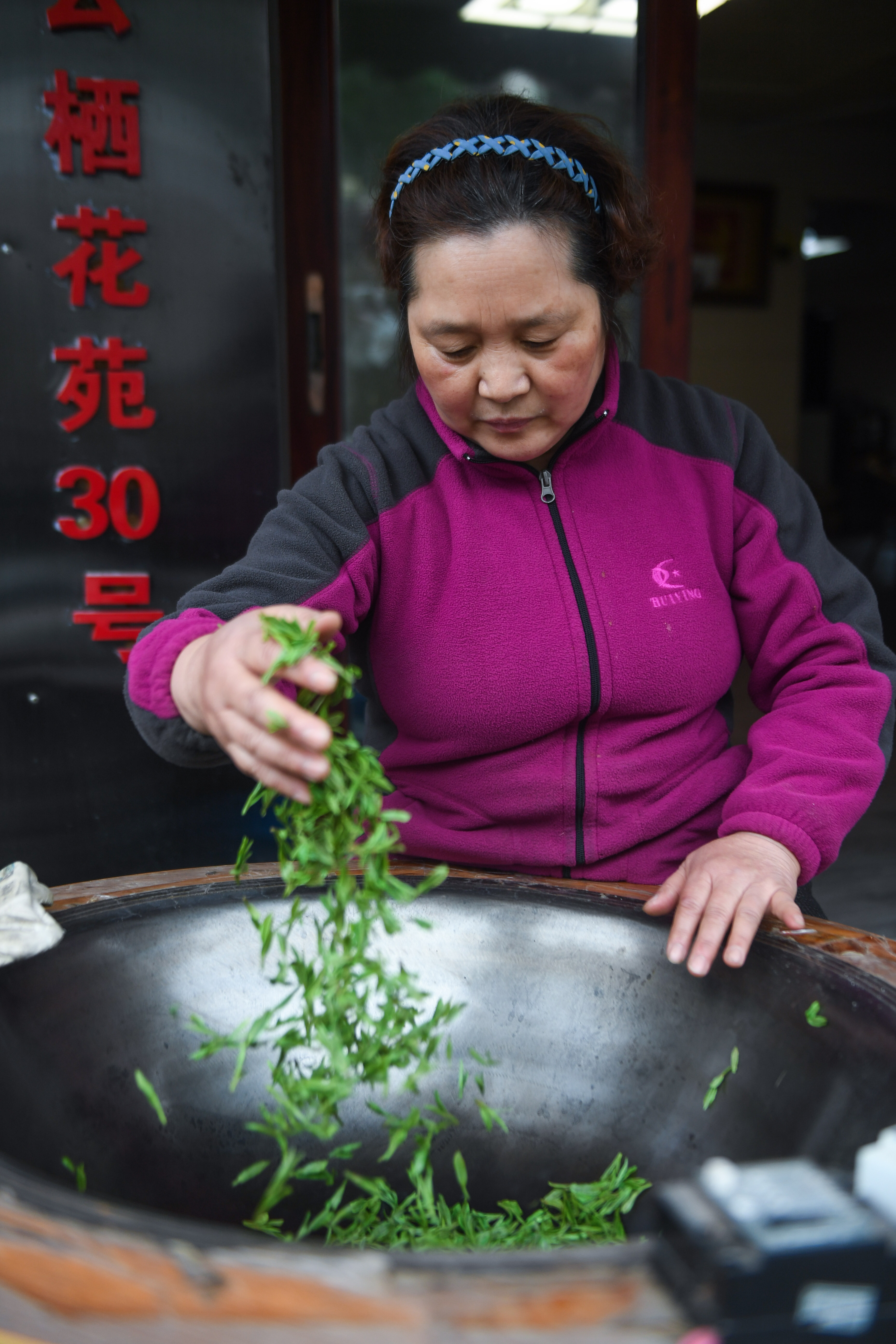 新华社照片,杭州,2022年3月18日 西湖龙井“明前茶”开采 3月18日,梅家坞村的茶农进行龙井鲜叶的手工炒青。 近日,浙江杭州西湖龙井茶一级保护区的梅家坞村、龙井村、翁家山村等产茶区的茶农开始采摘西湖龙井“明前茶”。3月以来,当地气温上升,光照充足,有利于茶树萌发生长,预计今年西湖龙井茶总体品质优于去年。 新华社记者 徐昱 摄