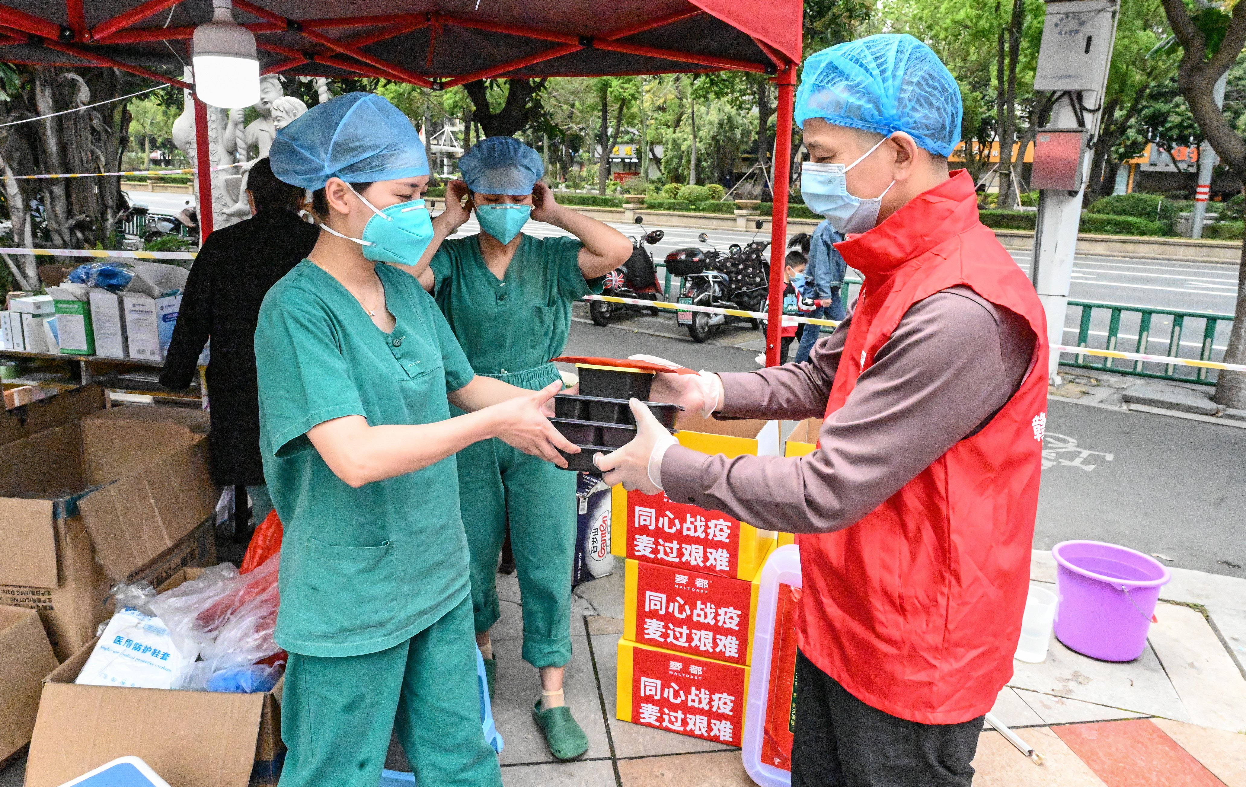 新华社照片,泉州(福建),2022年3月18日 一份餐,一片情,温暖一座城 3月18日,餐饮店志愿者在泉州市丰泽区一处核酸检测点发放爱心午餐。 在疫情防控的特殊时期,为了让抗疫人员吃上热饭菜,福建省泉州市近50家餐饮店组成“爱心送餐联盟”,进行公益捐餐。10份、200份、5000份……爱心送餐清单一直延续。截至当日中午12点,泉州市爱心餐已累计送出超8000份。战“疫”不停,爱不打烊,餐饮店商家用爱心温暖着疫情防控一线的人们。 新华社发(周义 摄)