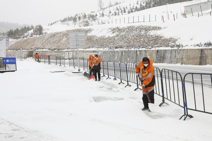 3月17日,工作人员在河北省张家口市崇礼区云顶滑雪公园清扫积雪。新华社发(武殿森 摄)
