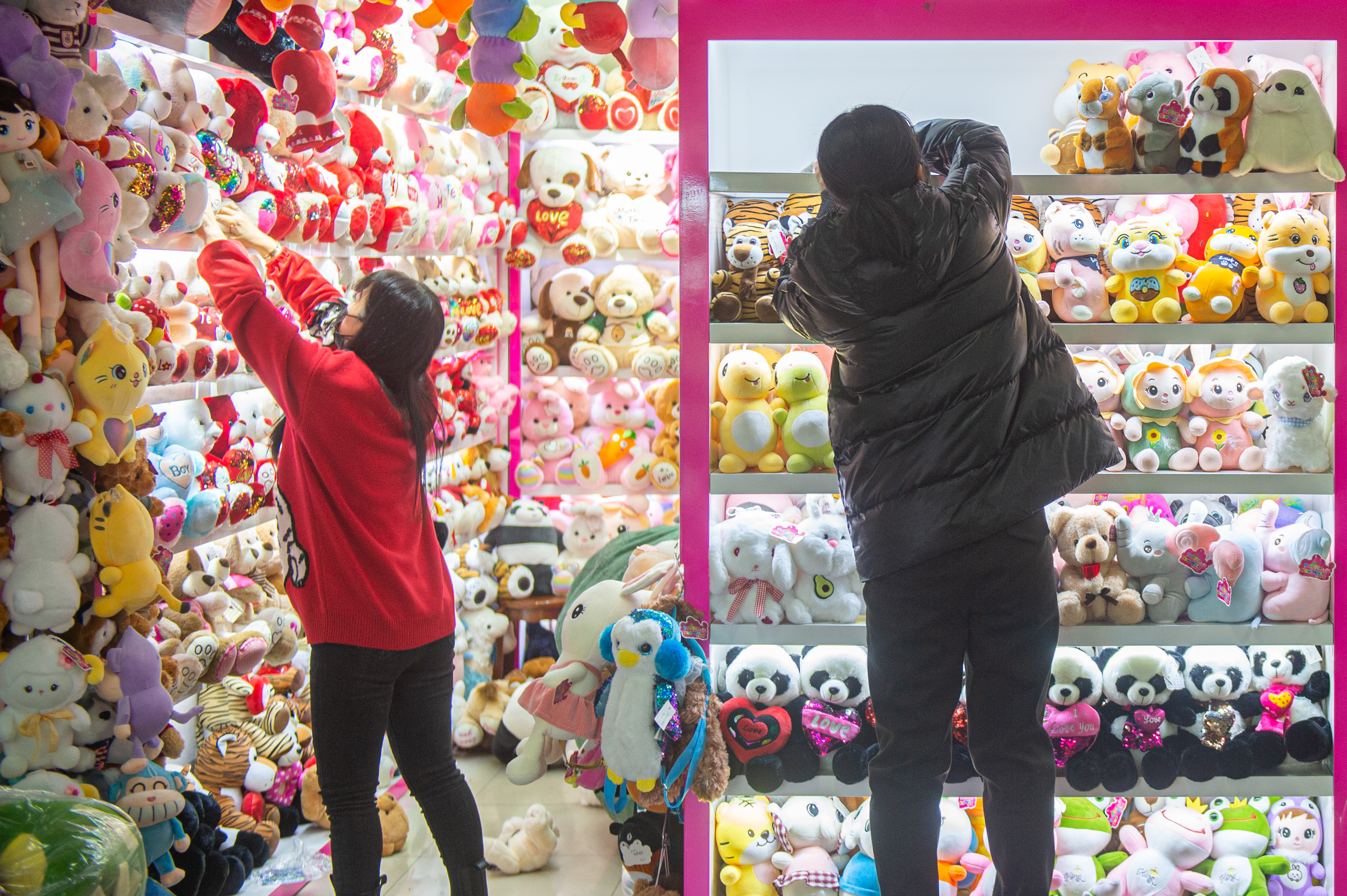 新华社照片,杭州,2022年3月18日 奋楫扬帆此其时——浙江锚定方向扎实推进共同富裕 义乌市中国小商品城经过春节假期的休整后重新开市营业,这是经营户整理货架(2月12日摄)。 (配本社同题文字稿) 新华社记者 江汉 摄