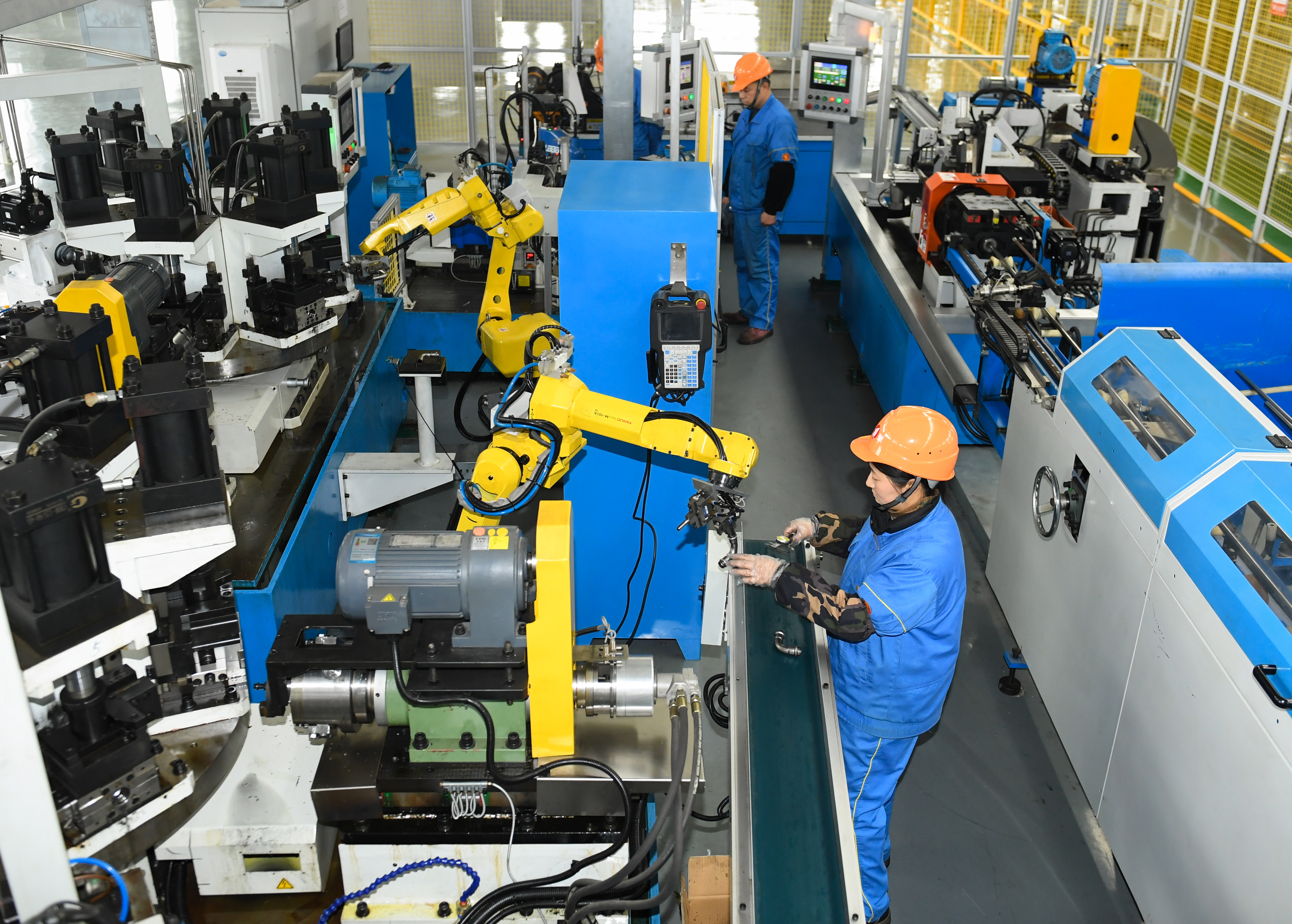 新华社照片,杭州,2022年3月18日 奋楫扬帆此其时——浙江锚定方向扎实推进共同富裕 在位于湖州市吴兴区八里店镇的金洲管道科技股份有限公司,工作人员和智能机器人协作生产不锈钢管件(2月14日摄)。 (配本社同题文字稿) 新华社记者 翁忻旸 摄