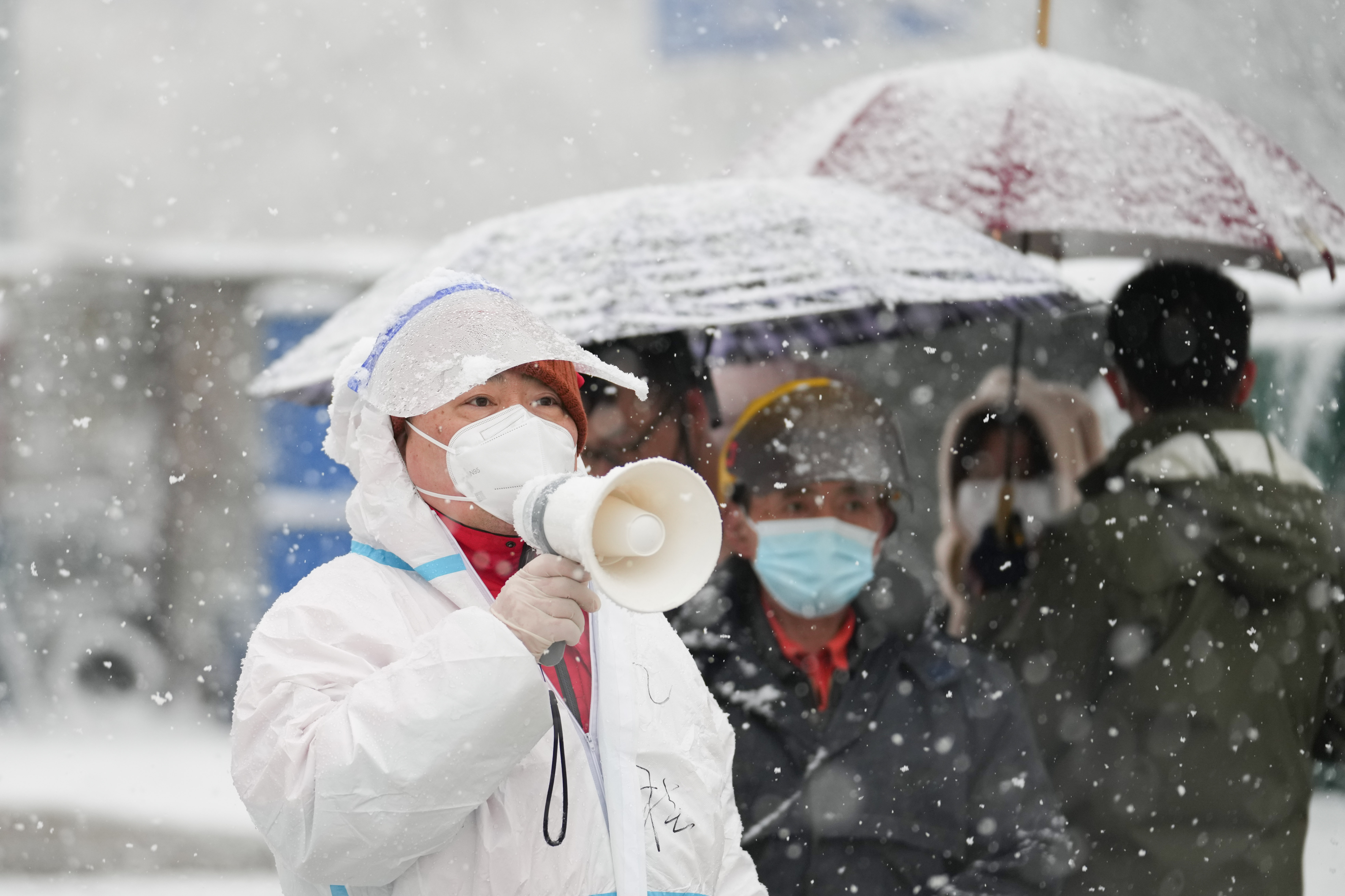 新华社照片,北京,2022年3月18日 北京:风雪中的坚守 3月18日,在北京市东城区北新桥街道一处核酸采样点,工作人员冒雪引导前来检测的居民。 当日,北京市迎来降雪天气。在北京市东城区北新桥街道的核酸检测点和封控小区,社区工作人员冒着风雪,坚守在疫情防控一线。 新华社记者 鞠焕宗 摄