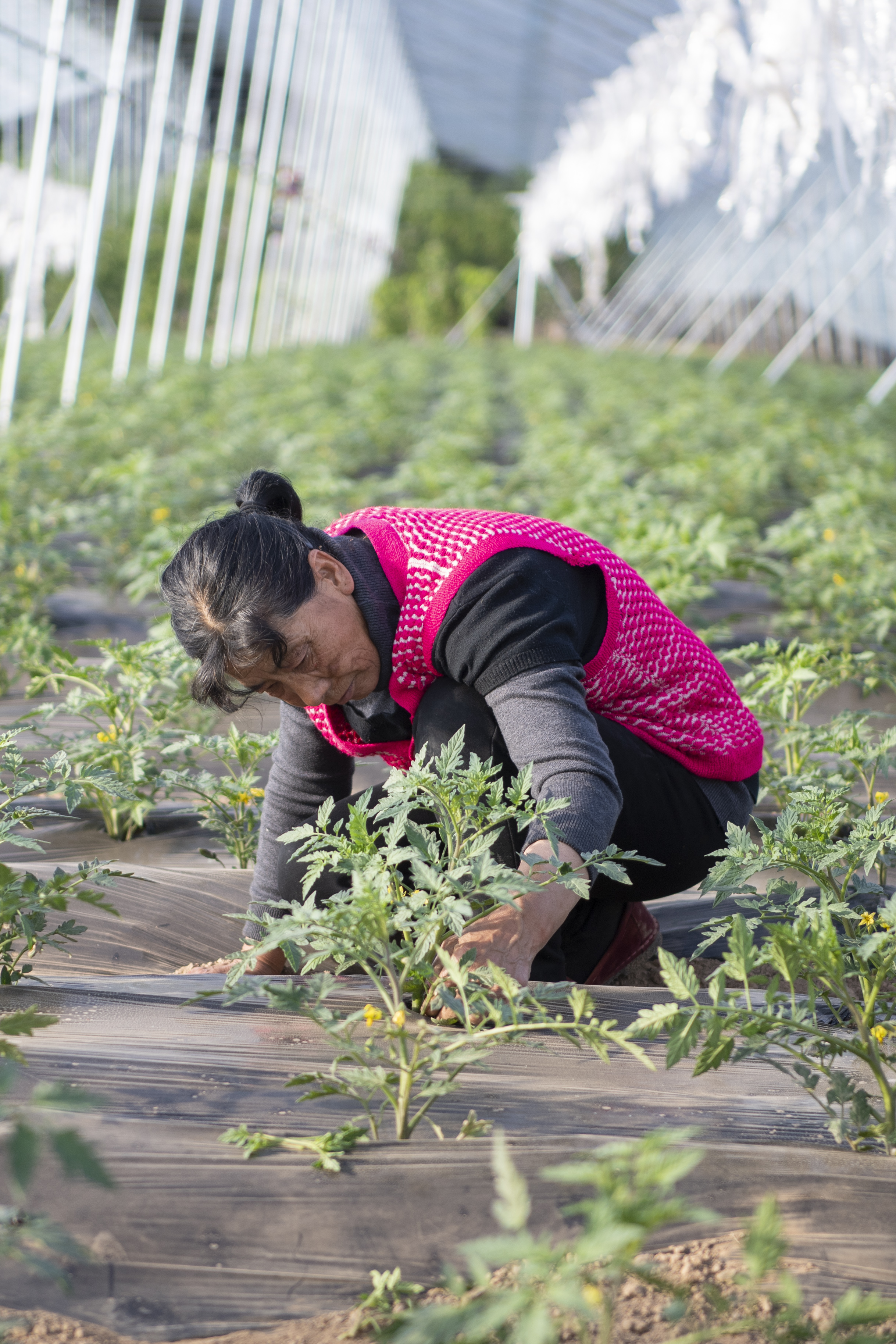 新华社照片,榆次(山西),2022年3月19日 大棚农事忙 在山西省晋中市榆次区庄子乡西墕村,村民在大棚内管护西红柿(3月18日摄)。 春日里,山西省晋中市榆次区农民抢抓农时进行农业管护,大棚里一派忙碌景象。 新华社记者 杨晨光 摄