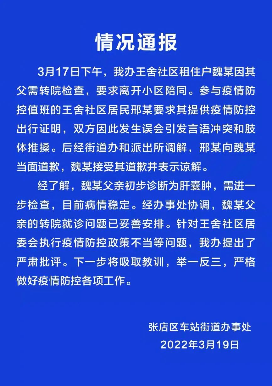 近日,“山东老人癌症晚期就医被小区要待死证明”引发关注。据山东淄博“张店区车站办事处”微信公众号19日通报:3月17日下午,张店区车站街道办王舍社区租住户魏某因其父需转院检查,要求离开小区陪同。参与疫情防控值班的王舍社区居民邢某要求其提供疫情防控出行证明,双方因此发生误会引发言语冲突和肢体推搡。后经街道办和派出所调解,邢某向魏某当面道歉,魏某接受其道歉并表示谅解。