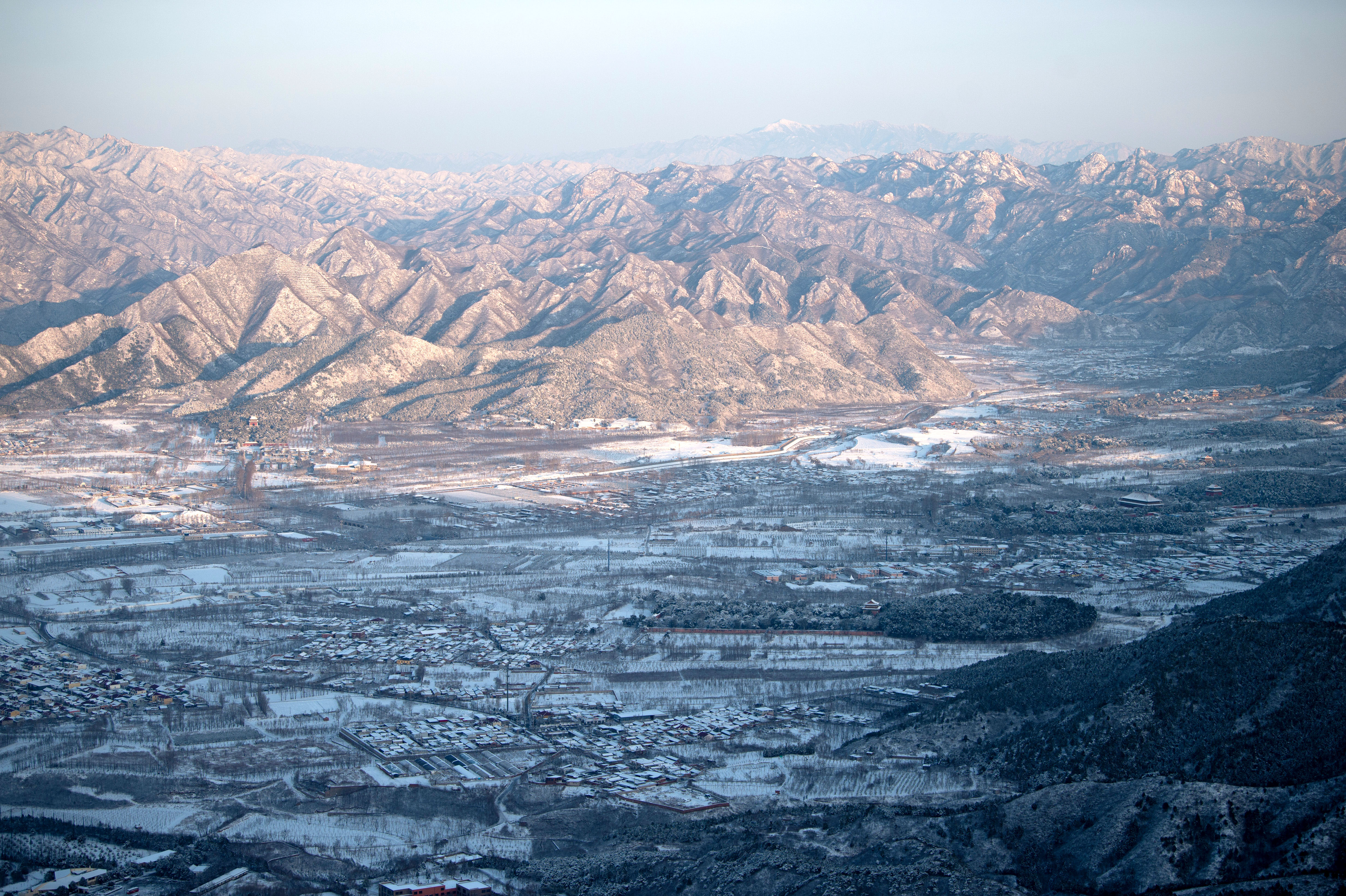 新华社照片,北京,2022年3月19日 雪后北京 这是从位于北京市昌平区的蟒山瞭望塔上拍摄的群山和村镇(3月19日摄)。 3月19日,春雪过后的北京景色宜人。 新华社记者 陈钟昊 摄