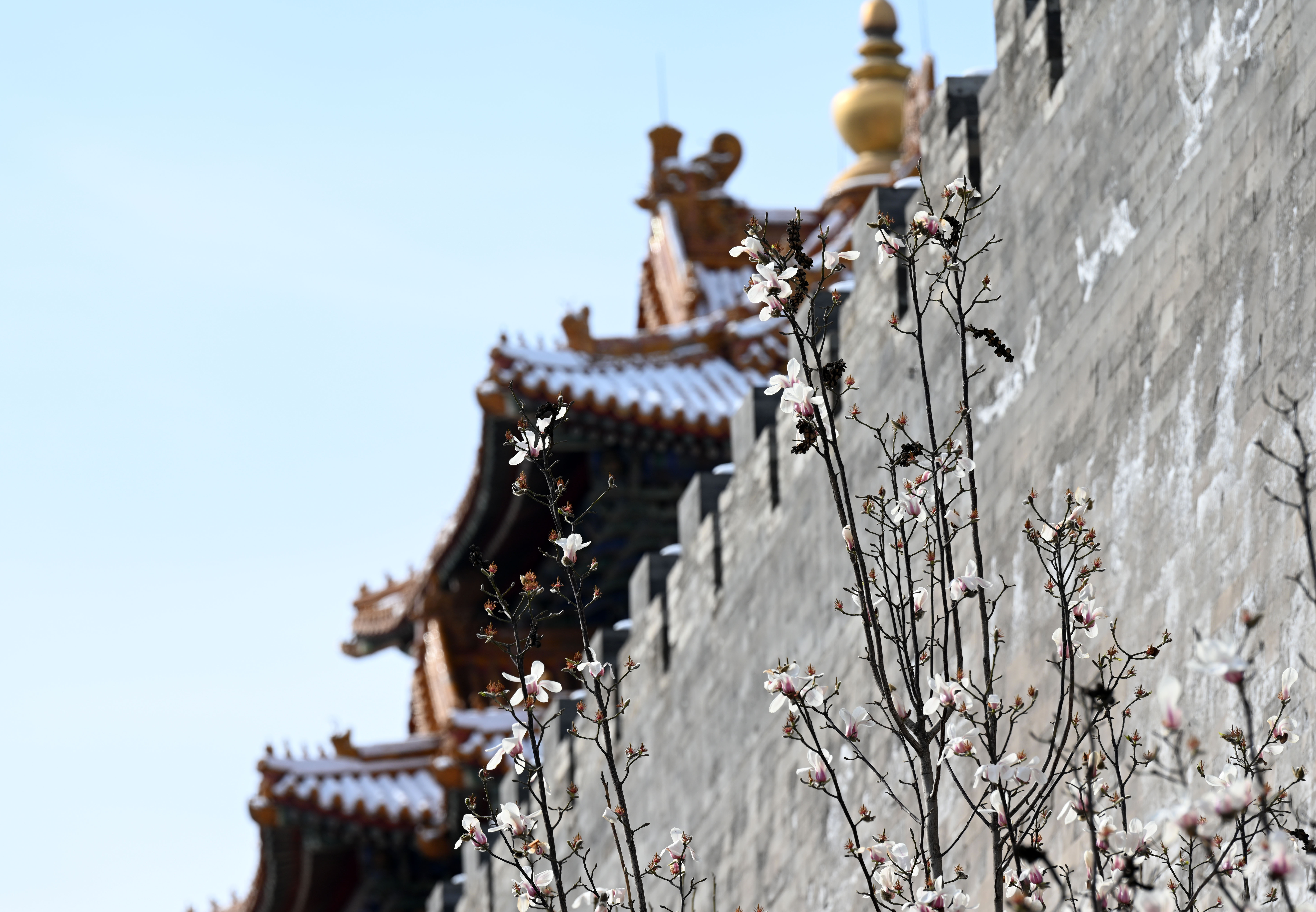 新华社照片,北京,2022年3月19日 雪后北京 这是故宫外的玉兰花(3月19日摄)。 3月19日,春雪过后的北京景色宜人。 新华社记者 金良快 摄
