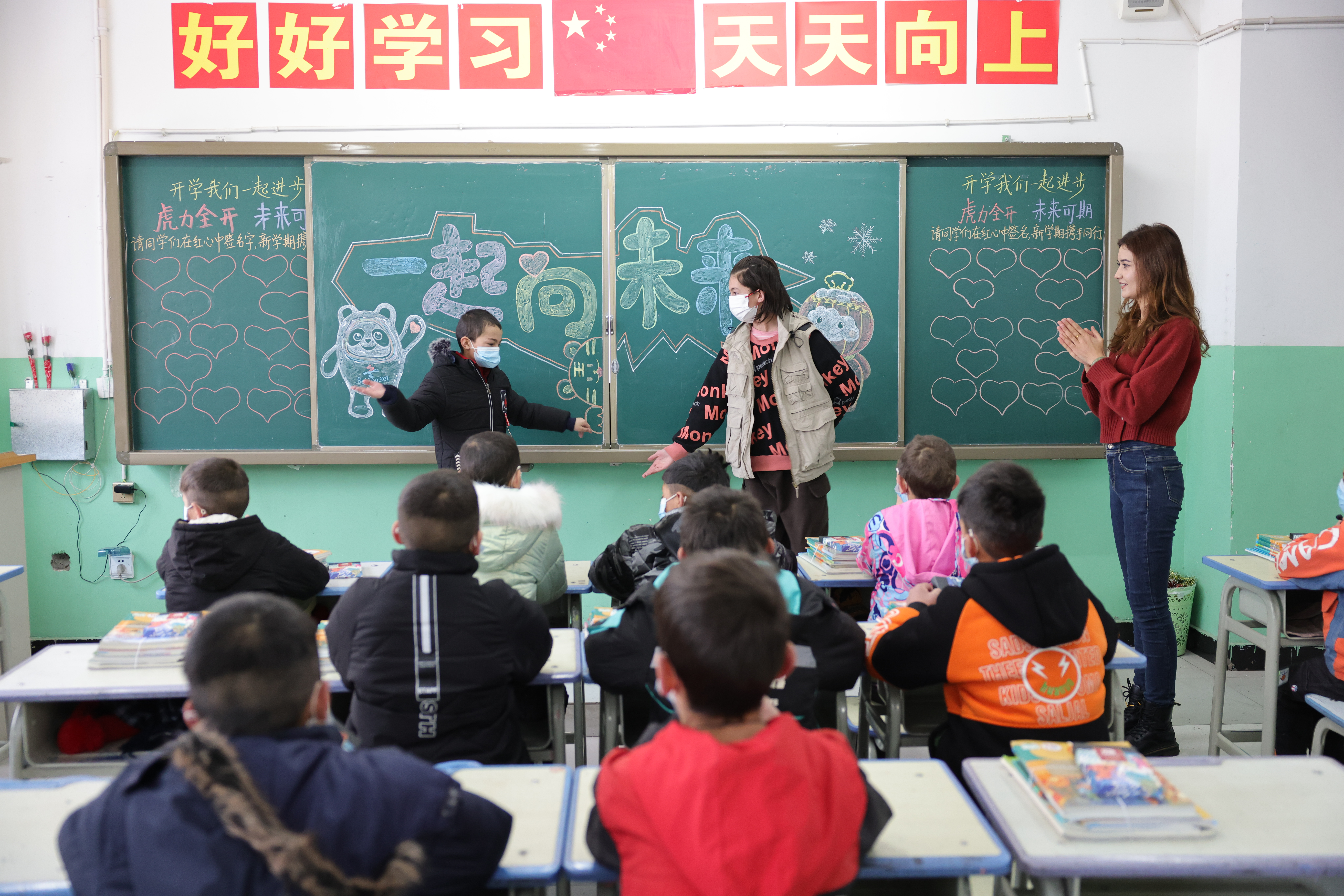 新华社照片,乌鲁木齐,2022年3月19日 绝险500里共赴春天之约——帕米尔高原教育之变 在新疆塔什库尔干塔吉克自治县城乡寄宿制小学,阿衣扎玛丽·米尔扎江(上左)和同学们一起上开学第一课(2月26日摄)。 (配本社同题文字稿) 新华社记者 丁磊 摄