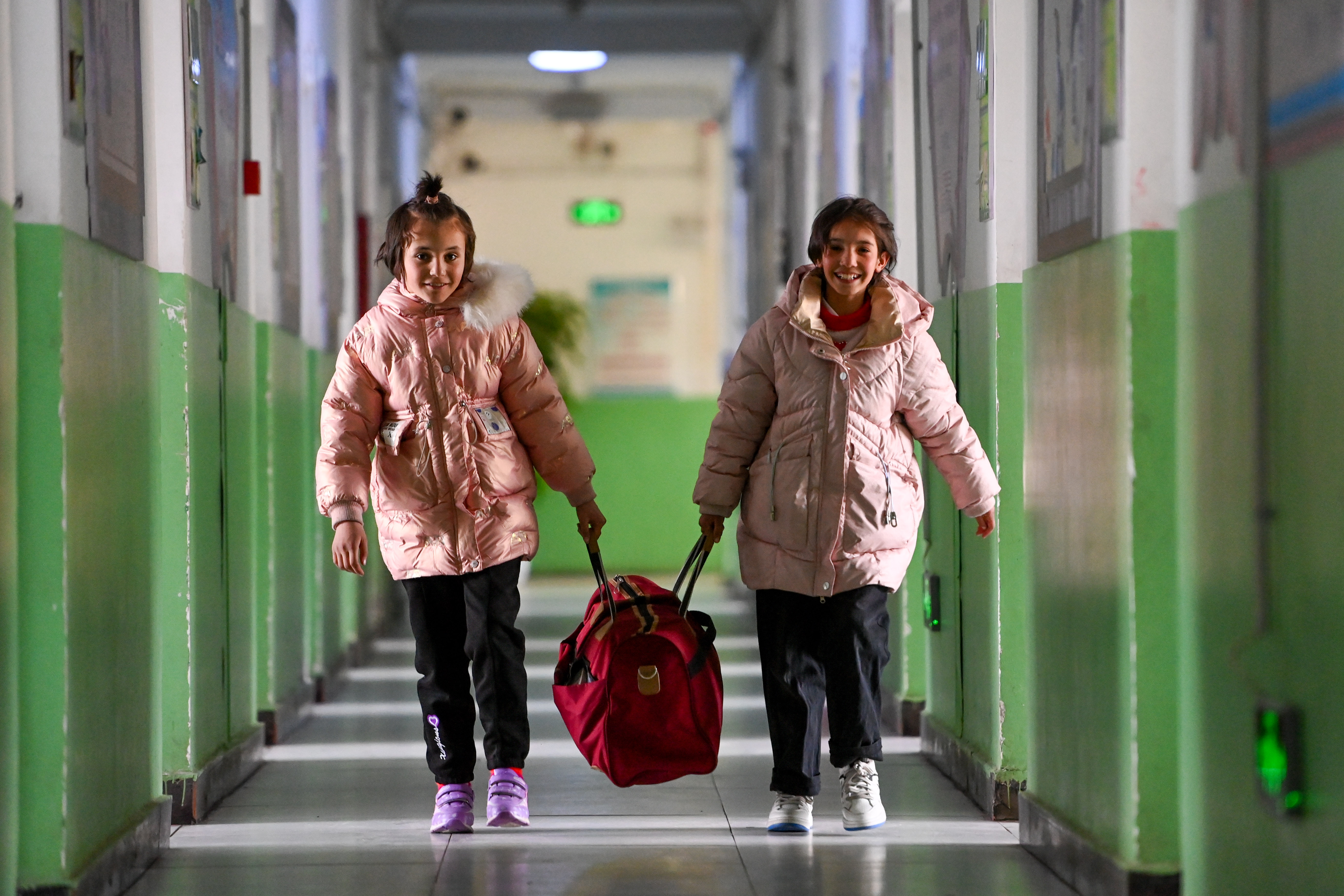 新华社照片,乌鲁木齐,2022年3月19日 绝险500里共赴春天之约——帕米尔高原教育之变 在新疆塔什库尔干塔吉克自治县城乡寄宿制小学,返校的学生走入宿舍楼(2月25日摄)。 (配本社同题文字稿) 新华社记者 丁磊 摄