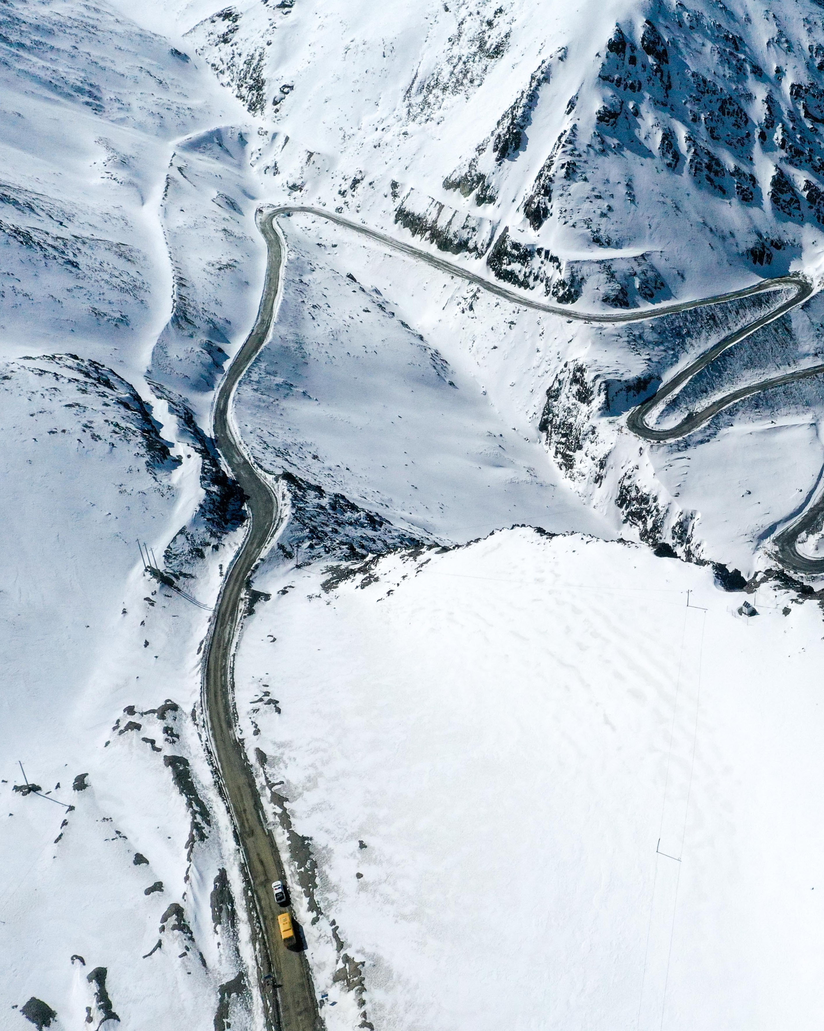 新华社照片,乌鲁木齐,2022年3月19日 绝险500里共赴春天之约——帕米尔高原教育之变 返校学生乘坐的校车翻越盖家克达坂(2月25日摄,无人机照片)。 (配本社同题文字稿) 新华社记者 丁磊 摄