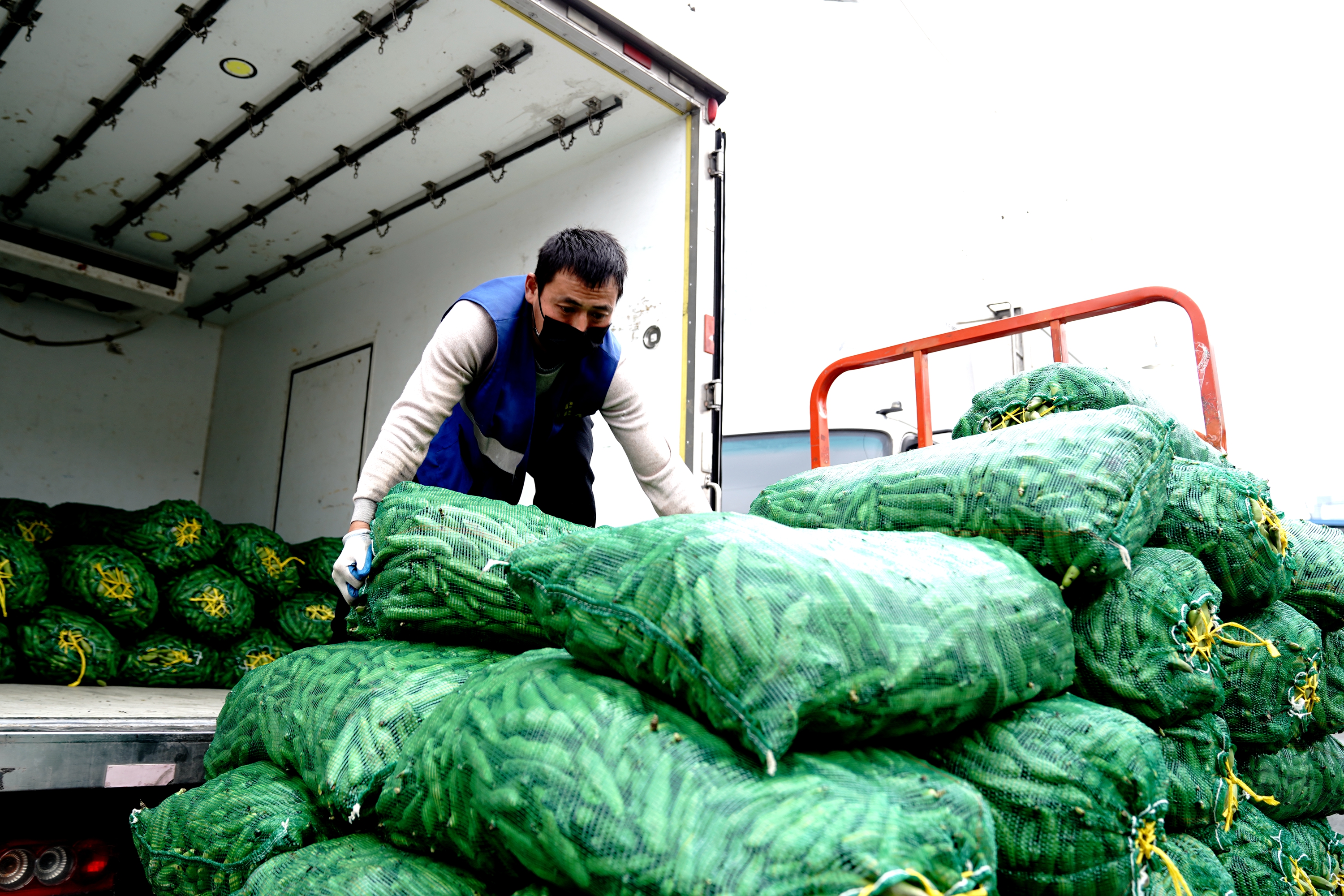 新华社照片,上海,2022年3月19日 探访上海最大蔬菜批发市场:严格防疫、交易红火 3月19日,江桥批发市场的短驳服务人员在搬运蔬菜。 为加强疫情防控,确保上海市民买到安全、健康的蔬菜,上海最大的蔬菜批发市场——江桥批发市场对所有进入市场的车辆和人员严格执行防控管理措施;所有进入市场的蔬菜交易前,都需通过农药残留检测。据介绍,这里每天的蔬菜交易量约为6000至7000吨,可满足上海市民60%以上的蔬菜需求。 新华社记者 张建松 摄