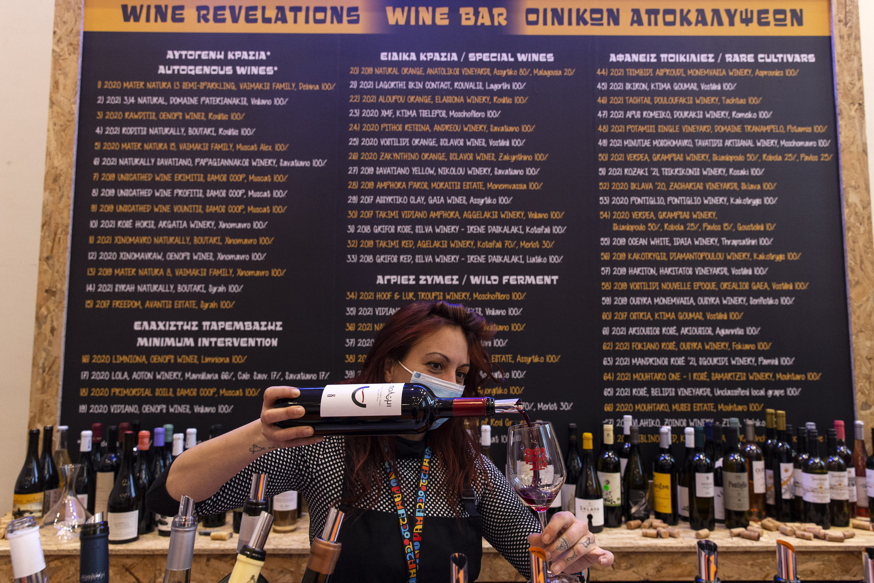 新华社照片,雅典,2022年3月19日 (国际·图文互动)(1)希腊葡萄酒行业期待进一步开拓中国市场 3月12日,工作人员在希腊雅典举行的“伊诺拉玛”葡萄酒博览会上为顾客倒酒。 (配本社同题文字稿) 新华社发(马里奥斯·罗洛斯摄)