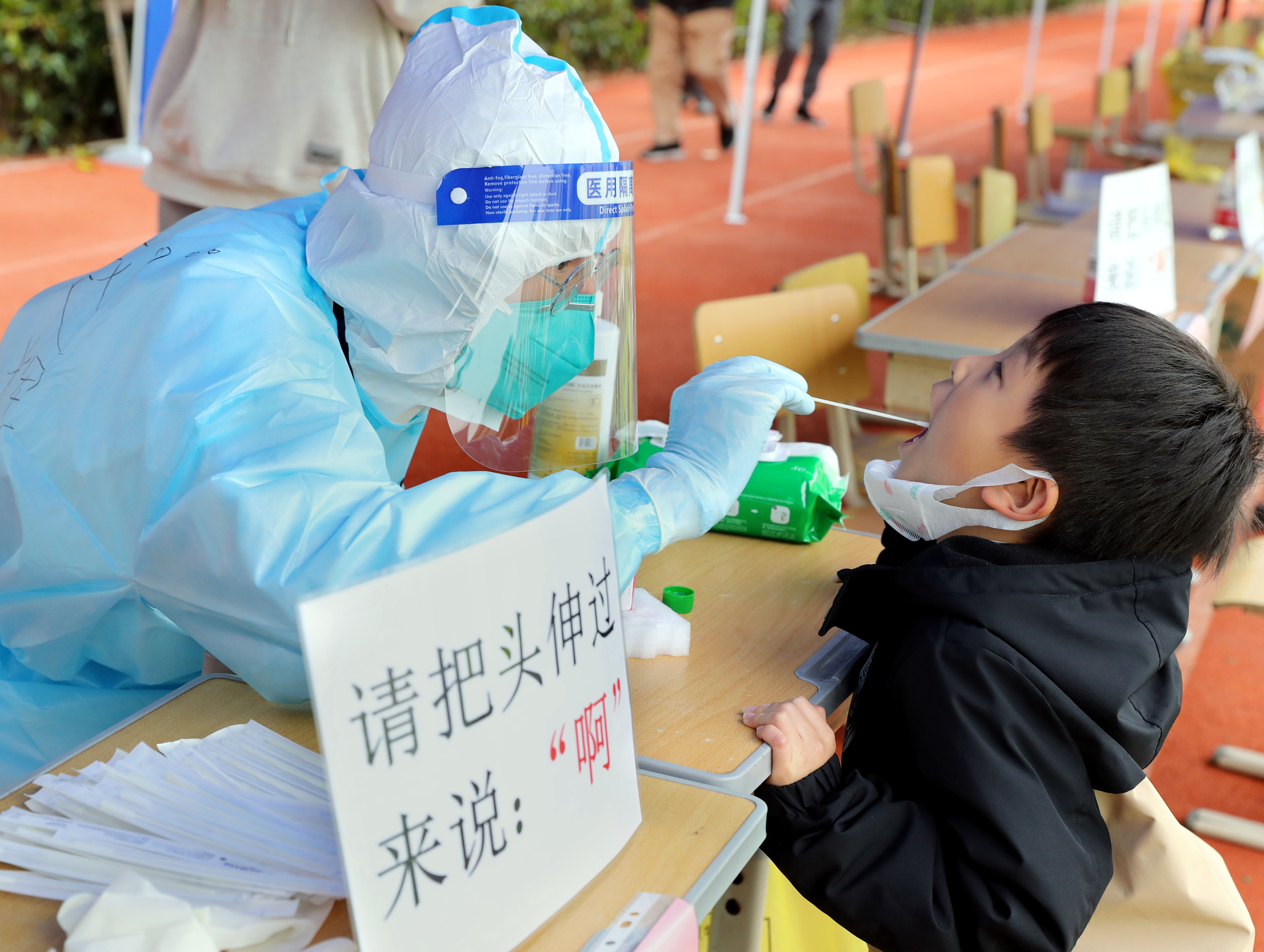 新华社照片,上海,2022年3月19日 上海最大小区开展核酸检测 3月19日,检测人员为上海康城居民进行核酸采样。 3月19日、20日,上海市闵行区的上海康城开展两次核酸检测。记者在康城实验学校的操场看到:引导牌、扫码箱、小喇叭等,成为数百名居民志愿者现场服务的“神器”;小区以楼栋为单位分时、分批参加检测,居民们的自律与配合使检测现场平稳有序。 上海康城共有286个楼栋,约4万居民,是上海最大的居民小区。 新华社记者 刘颖 摄